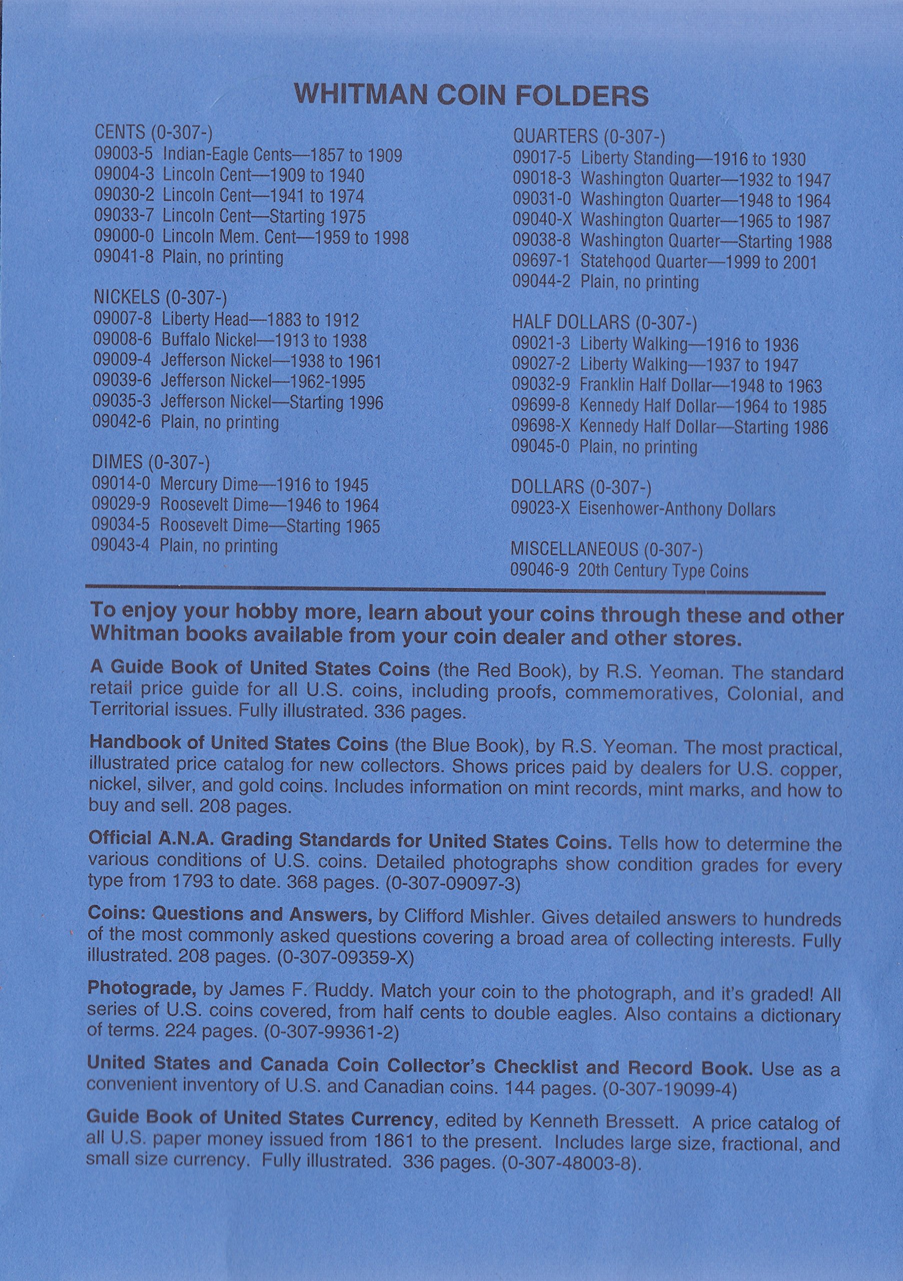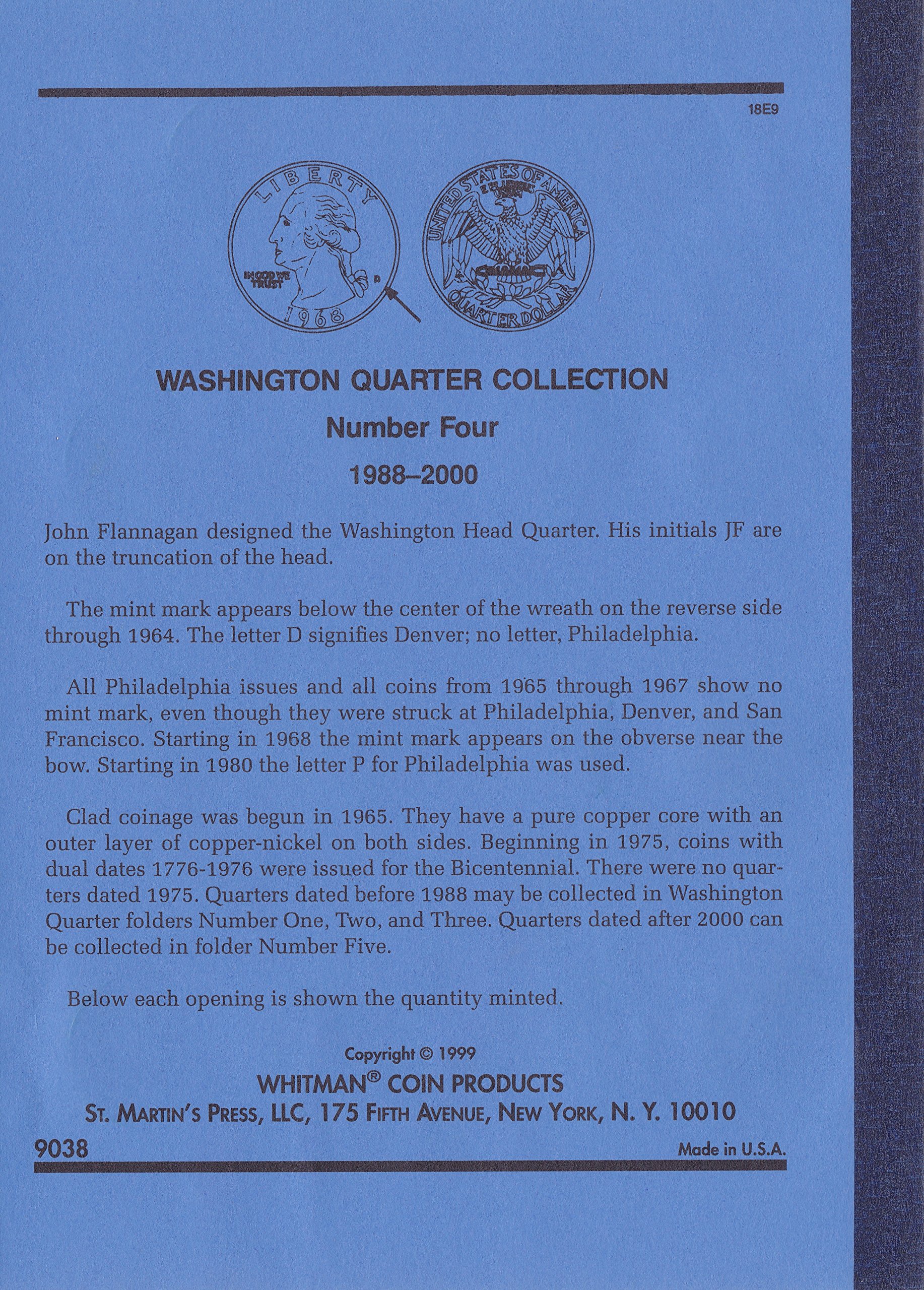 Whitman Folders - Washington Quarter No. 4, 1988-2000, 43 openings. Folder opens flat for all-at-once viewing and includes data pertaining to the coins it holds. Whitman Folders are built from the safest archival safe materials known. 1 each.