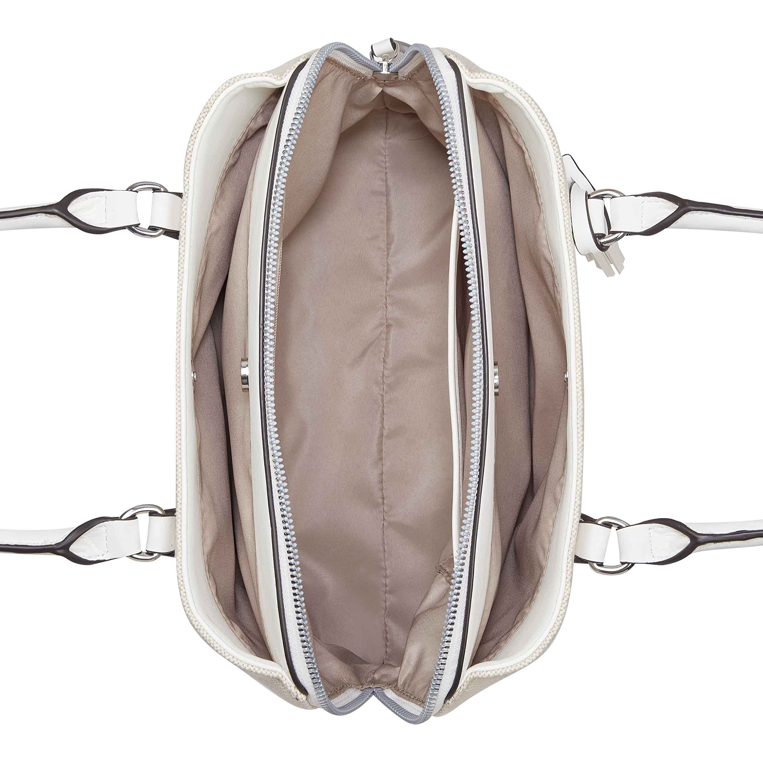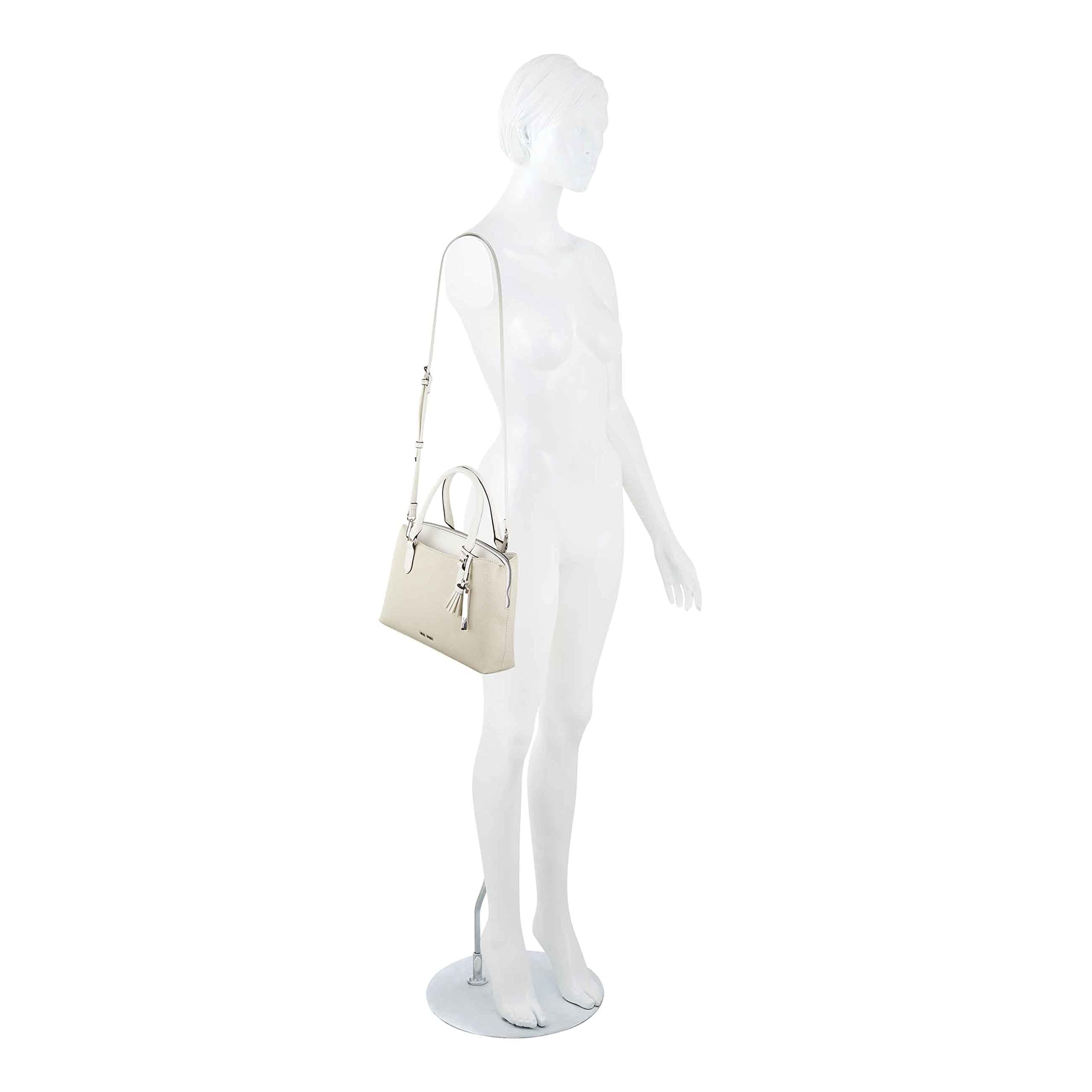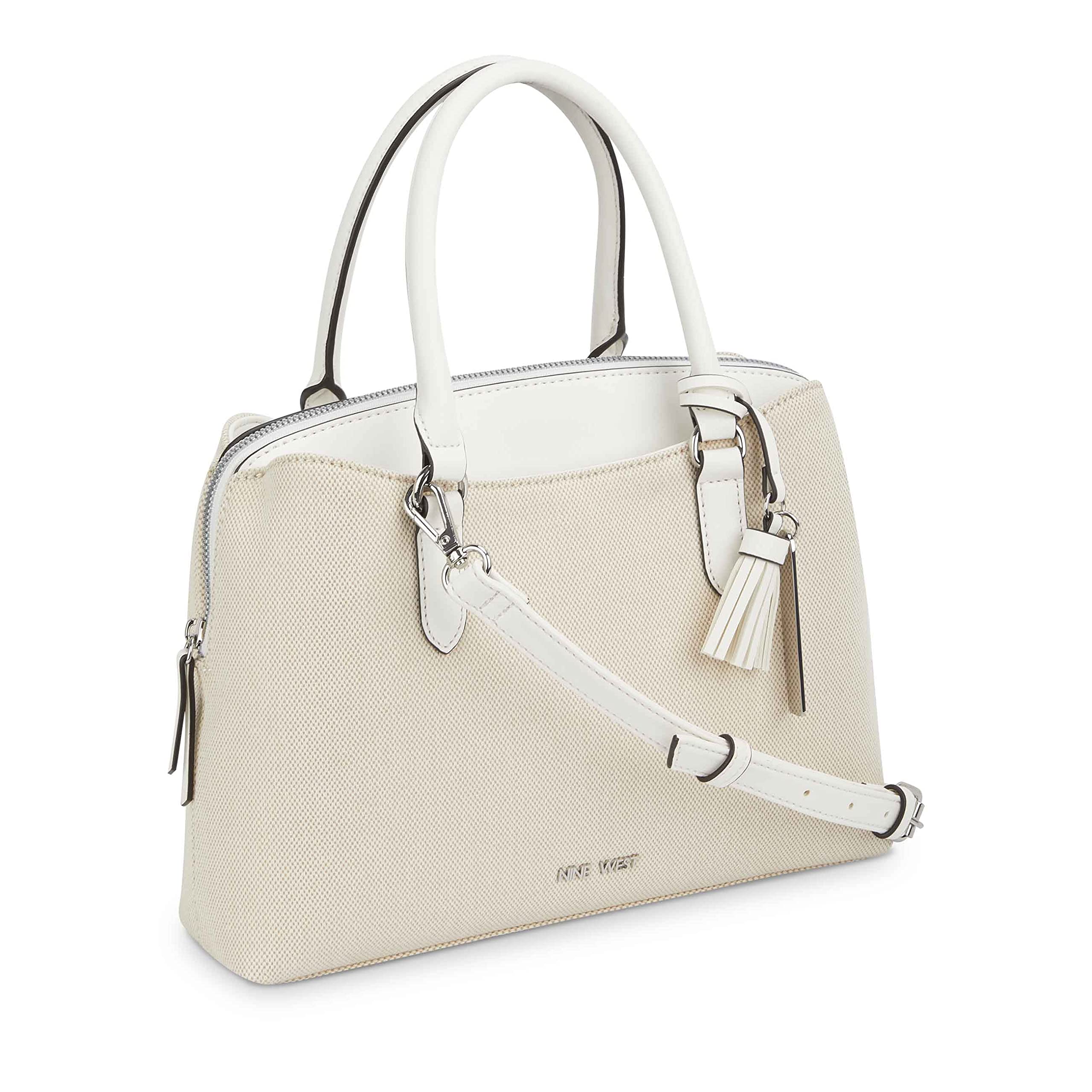Description Get spacious comfort and an elevated style carrying the Nine West Galla Dome Satchel Bag. PVC construction. Top carry handles. Removable crossbody strap. One zippered exterior pocket. One interior front wall slip pocket. Two exterior compartments with snap closure. Accentuated with an eye-catching dangle. Brand name hardware on the front. Polyester lining.