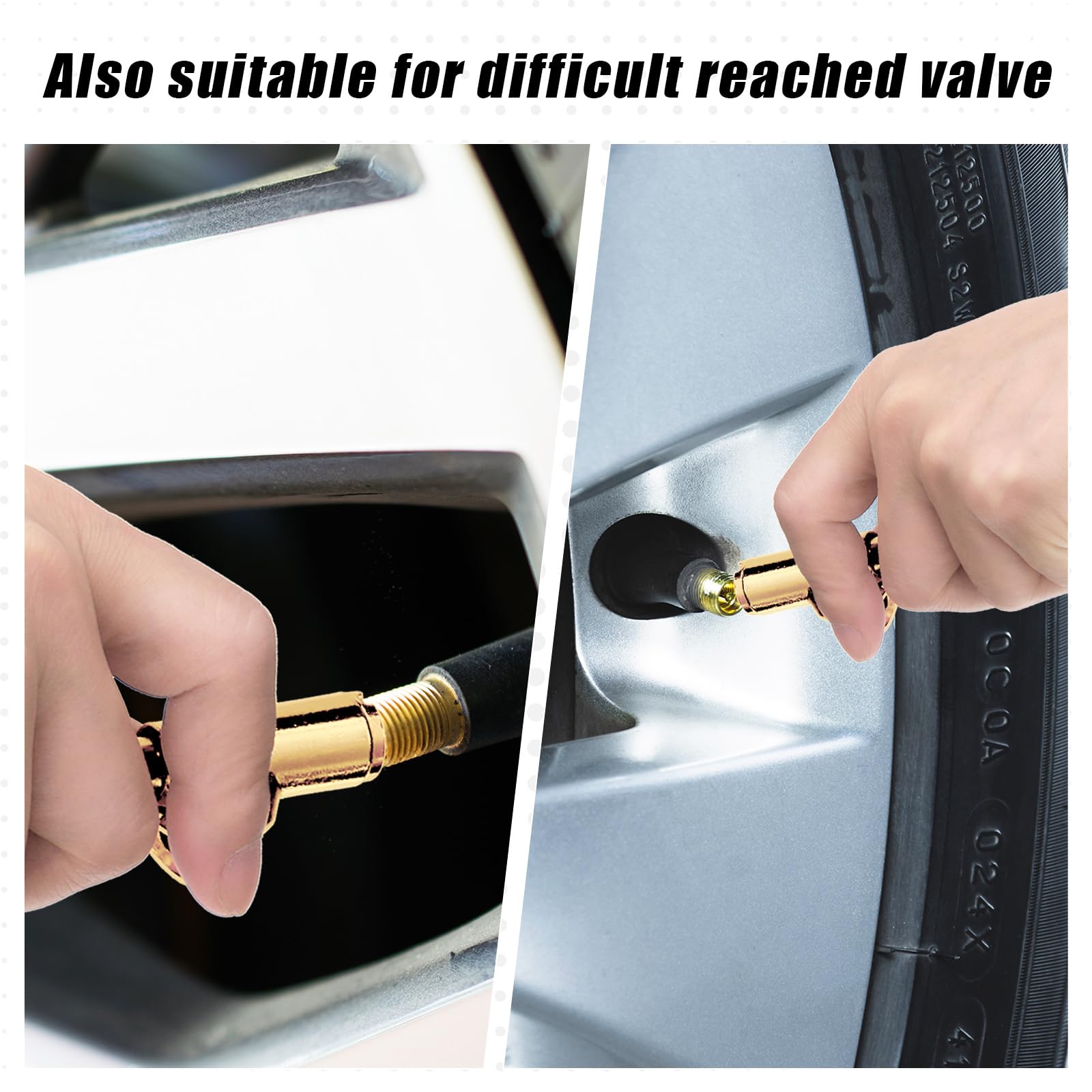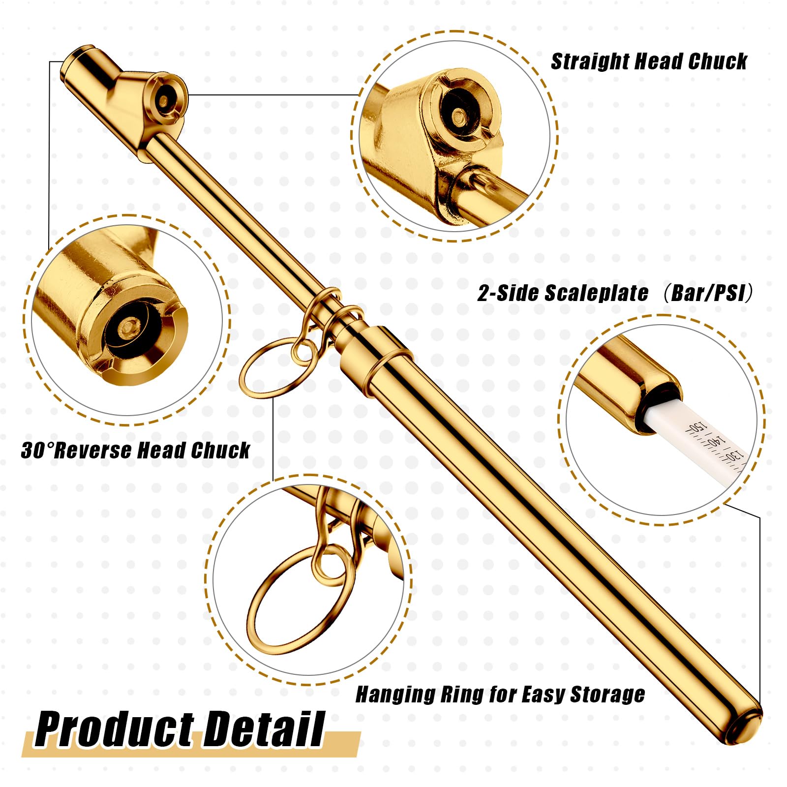 Dual Head Chucks Design: air pressure tire gauge is equipped with two long zinc alloy head push pull chucks, suitable for inner wheels or difficult reached valve as well as the 30 degree reverse chuck for outer wheels; It has long stem which allow you to reach the inner wheels without dirty your hands