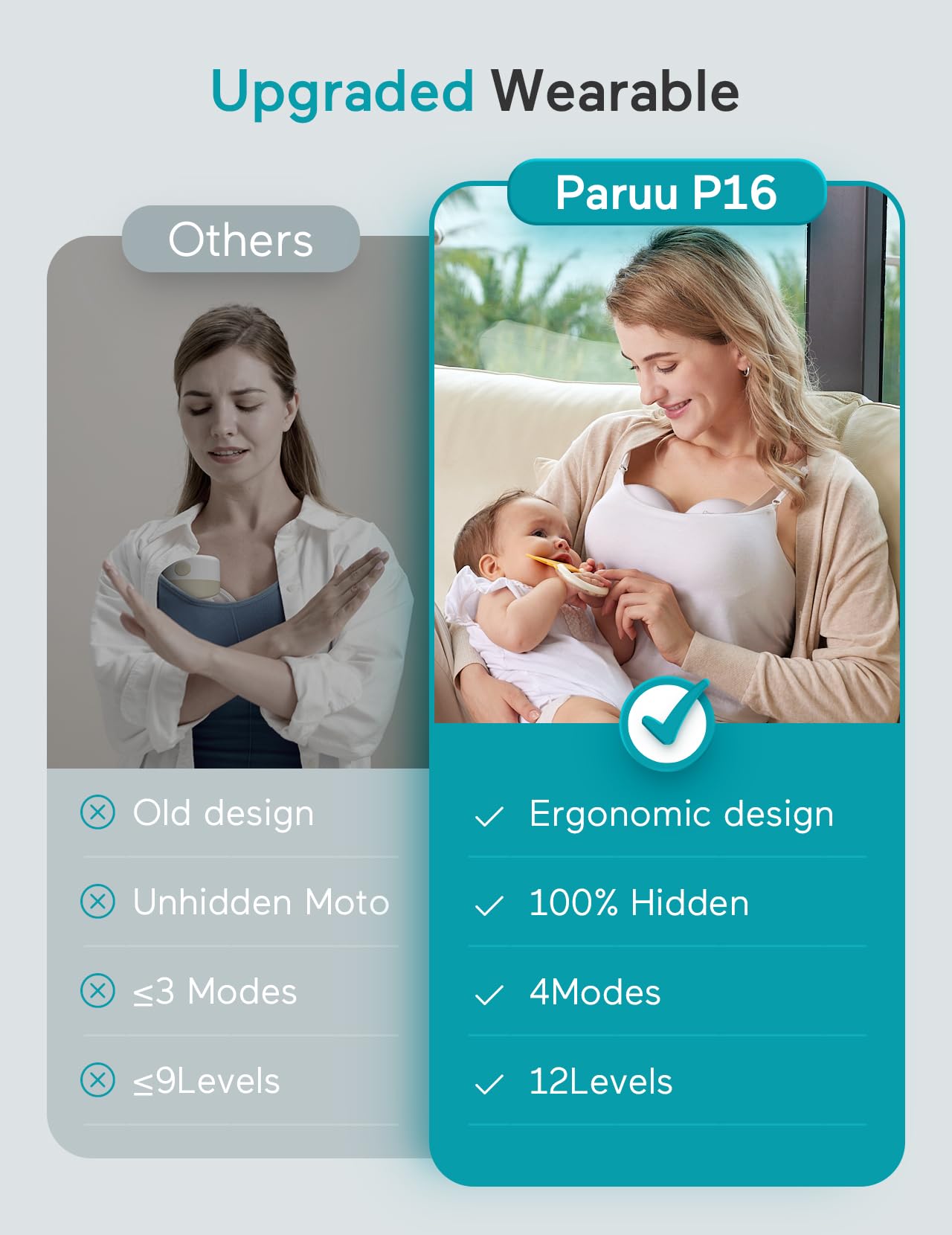 Lighter & Smaller: Paruu P16 breast pump only 240g, Only 2/3 the size of a manual breast pump. It is a truly wearable breast pump, fits snugly around your bra and breasts, provides better hidden and comfort. Help busy mothers free hands, no occasion restrictions freedom to pump anytime, anywhere.