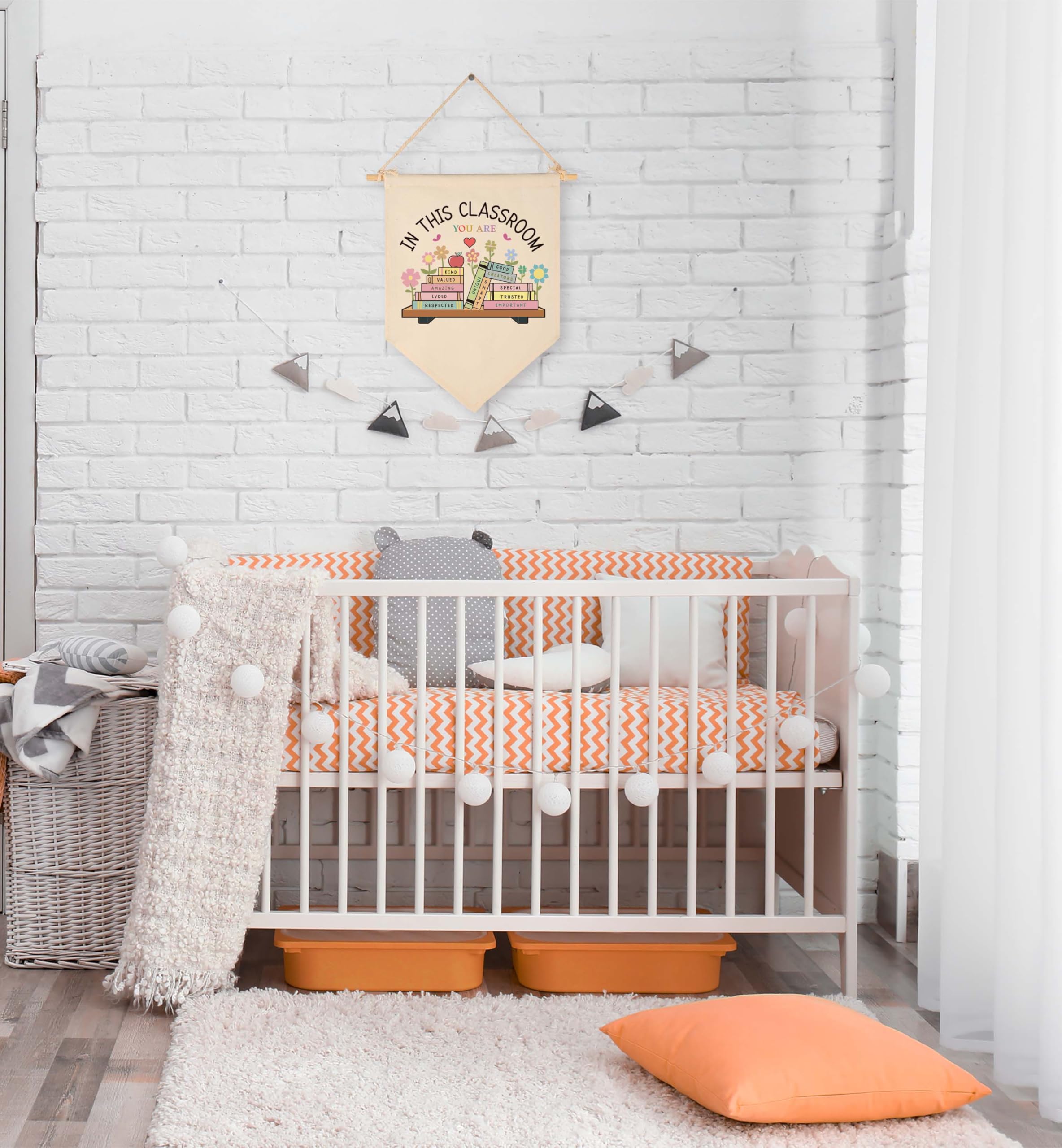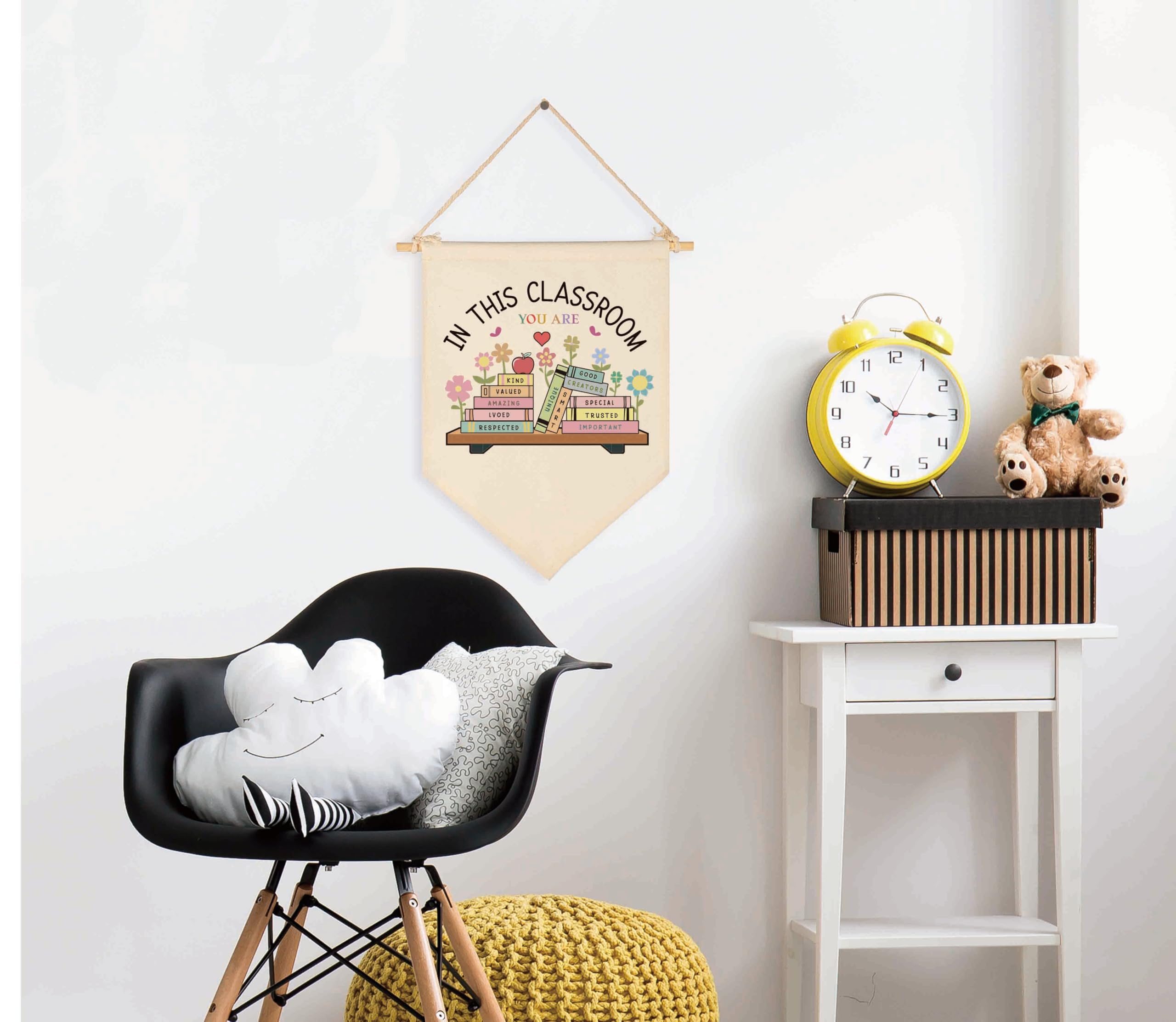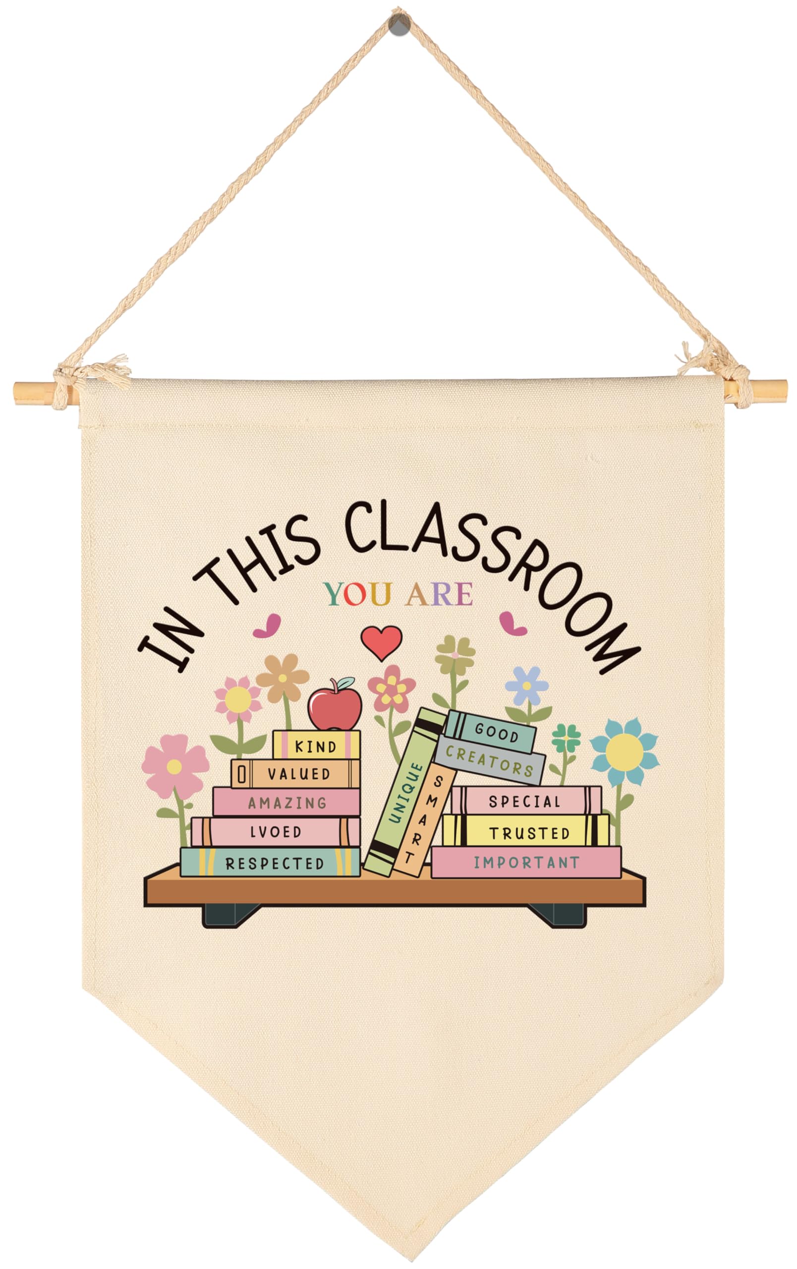 READY TO HANG CONVENIENCE: No assembly or extra hardware needed for busy teachers and librarians. Each 15.5x11 inch pennant comes pre-installed with a natural solid wooden rod and a rustic twine rope, making it easy to instantly enhance any educational workspace