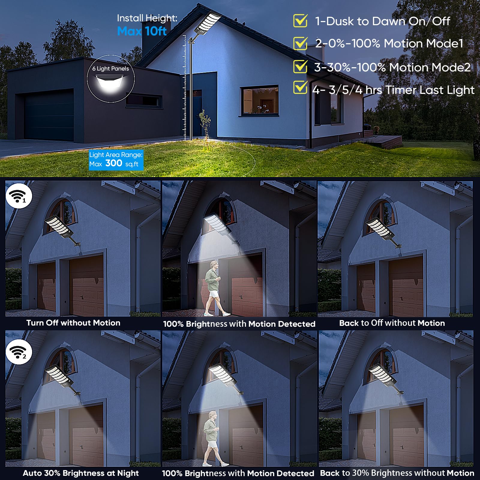 Smart Remote Control | 4 Lighting Modes: Custom Brightness: Choose 25%/50%/75%/100% in dusk-to-dawn mode (exclusive). Motion Intelligenceļ¼ Mode 1: 30% dim light + 100% when motion detected; Mode 2: Auto-off standby + instant 100% activation when motion detected.