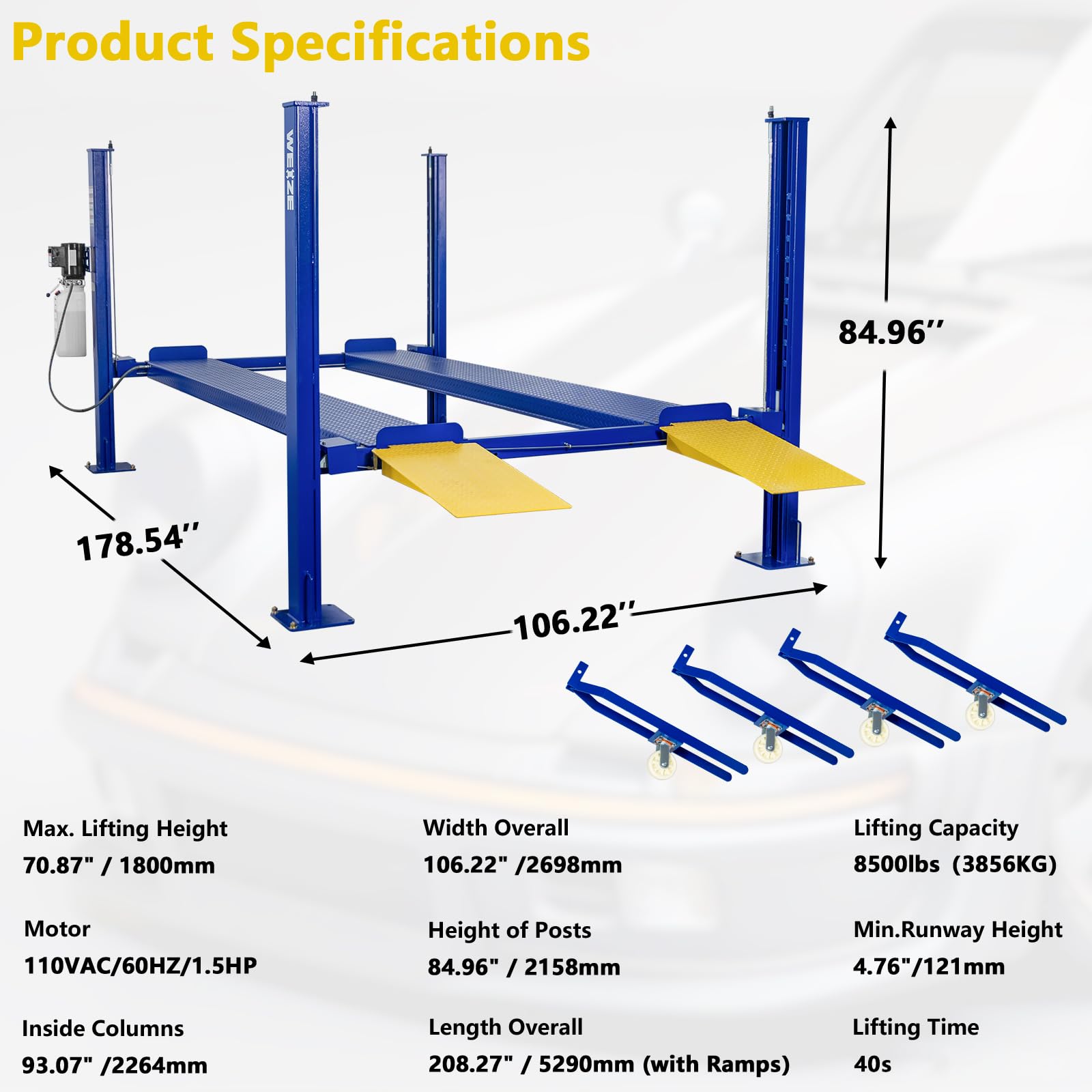 High-Capacity & Versatile - Supports 8,500 lbs lifting weight (9,500 lbs dynamic / 11,880 lbs static) for trucks, SUVs, and sedans. Drive-through width: 93" fits most vehicles effortlessly.