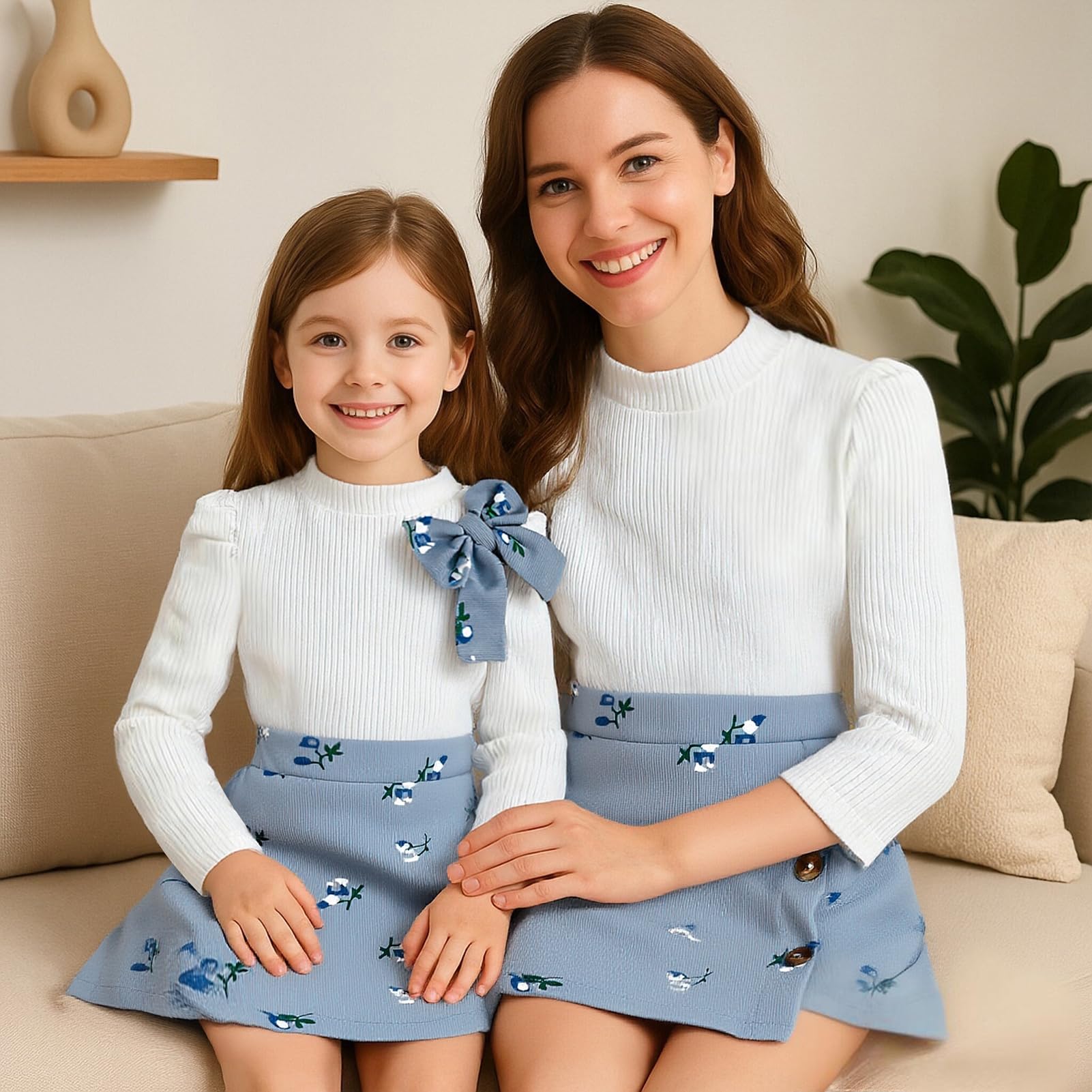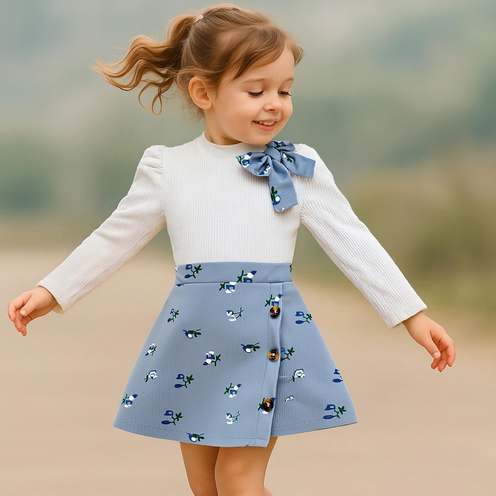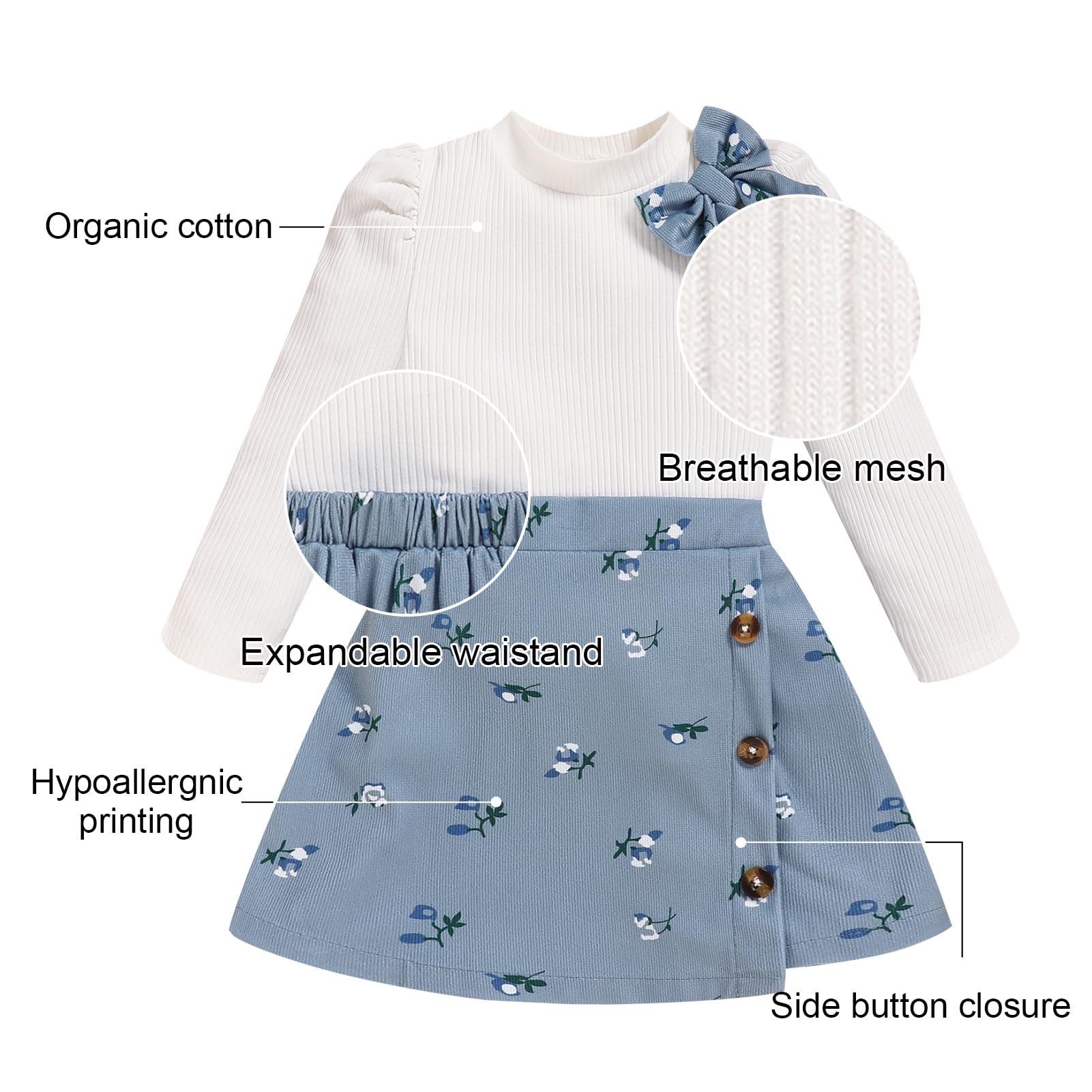 MATERIAL: Toddler girl shirt sweater top is made of cotton and polyester, bottom skirt is made of cotton blend and polyester, soft, breathble, and comfortable, sweet toddler baby girl 2 piece skirt set, cute baby girl clothes.