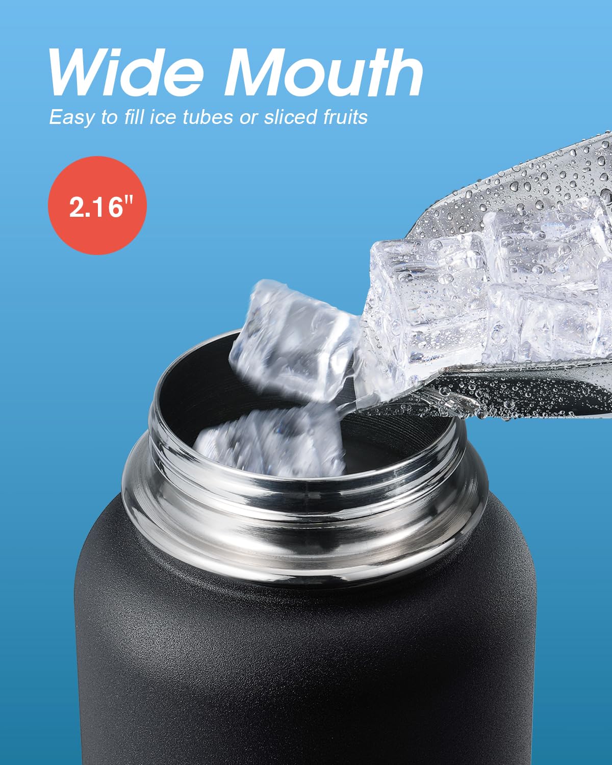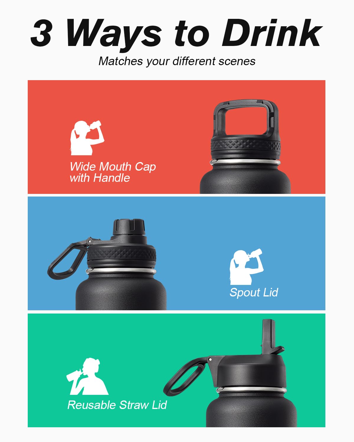 Flexible Drinking On-the-Go: This 40 oz water bottle comes with 3 different lids. The screw-on lid with flip-up handle is for easy ice refilling with superior portability; spout lid makes it convenient to drink hot liquid and straw lid for sipping cold.