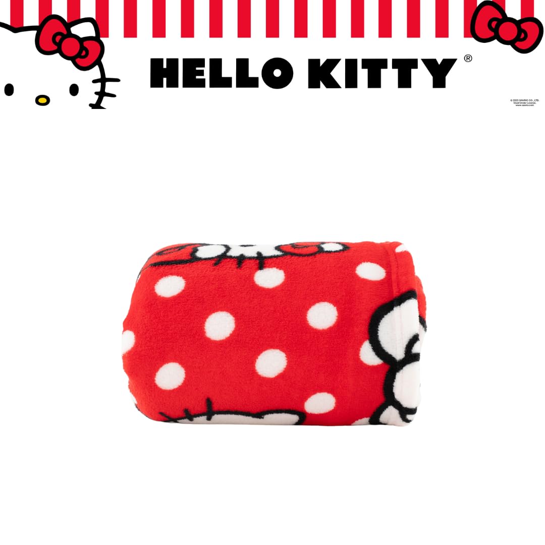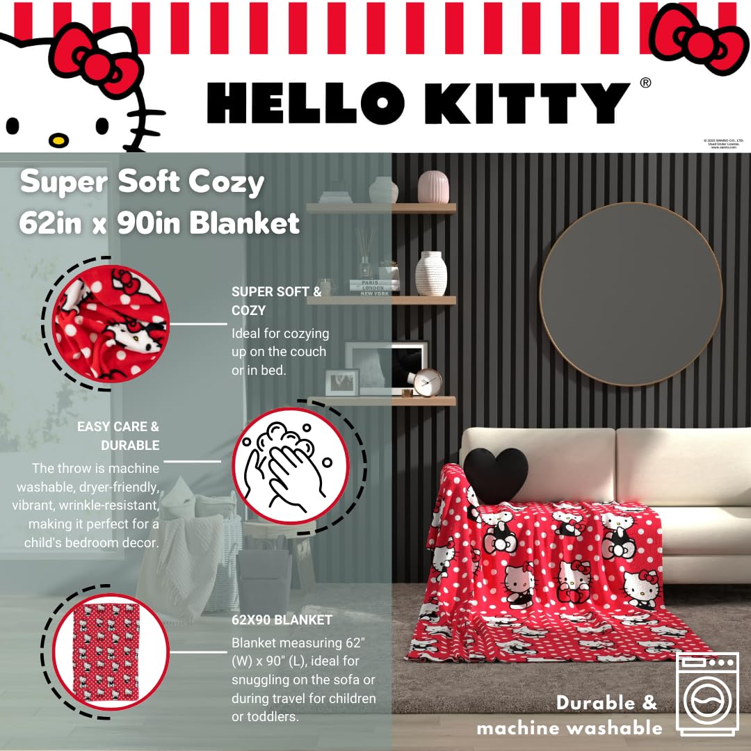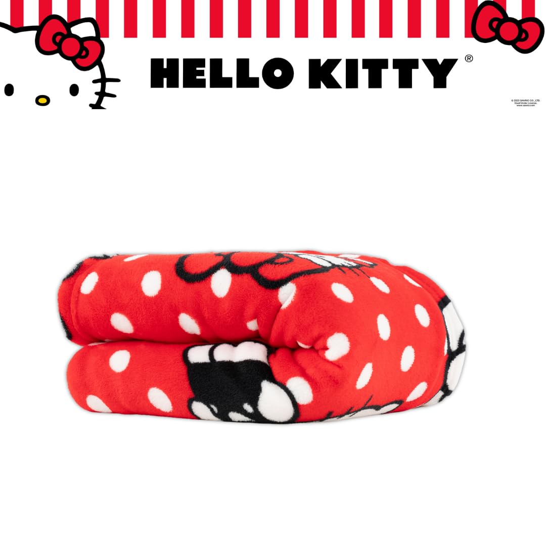 HELLO KITTY DESIGN: Cozy up with this ultra-soft 62"x90" micro raschel blanket featuring Hello Kitty in adorable poses on a red polka dot background. A fun and playful pick for fans of the iconic Sanrio character!