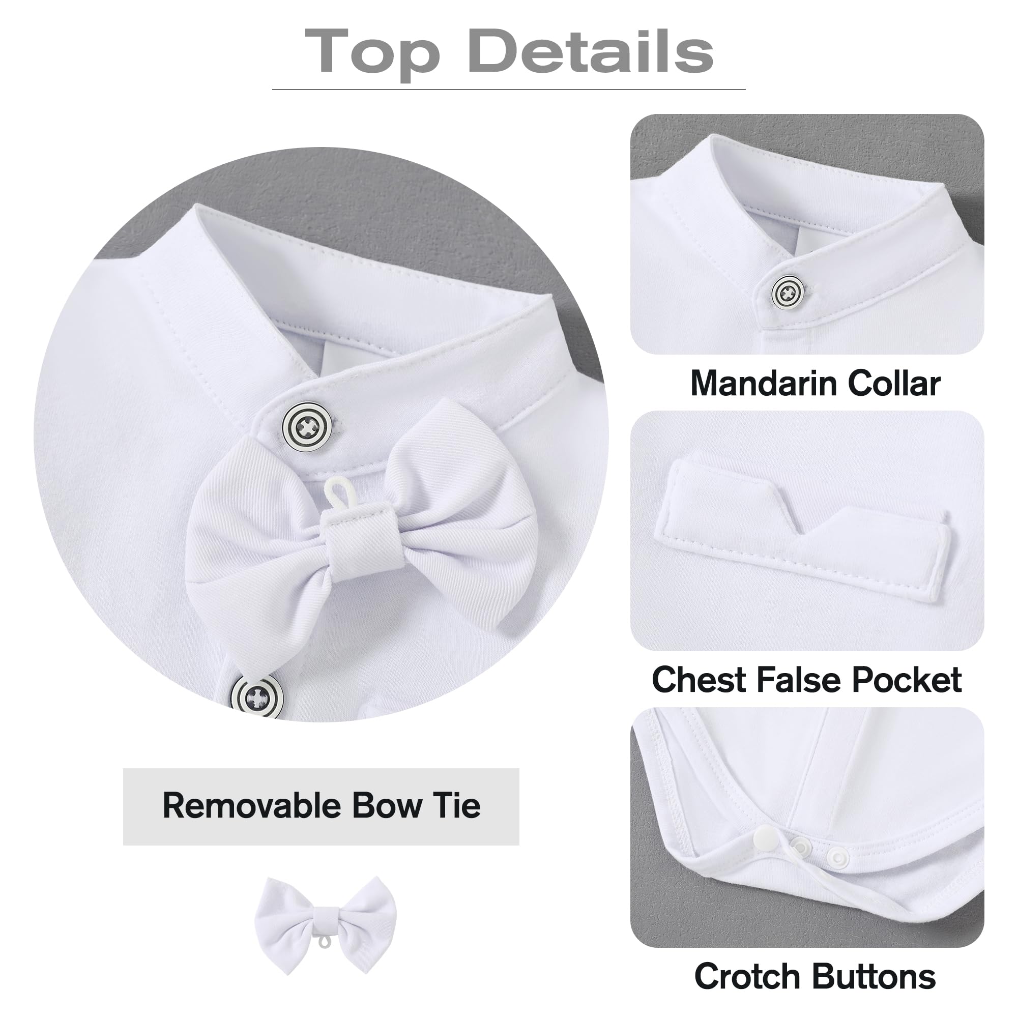 Unique Design: The baby boy suit shirt features a unique stand-up collar design and detachable bow tie, which is fashionable and cute, without worrying about neckline curls or wrinkles. This shirt has buttons on the crotch for easy on and off and diaper changing