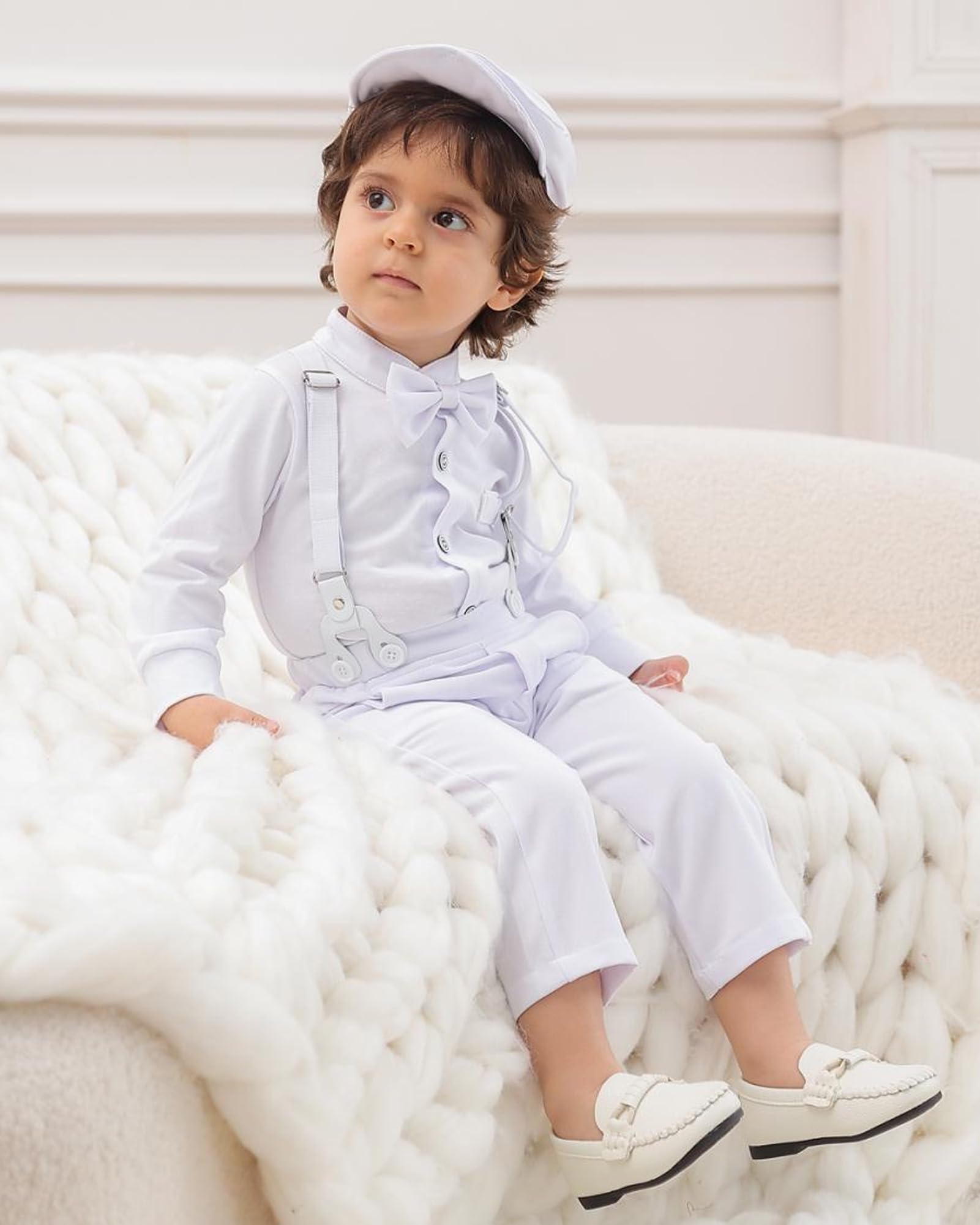 Size Selection: Our baby suits are suitable for newborn boy clothes 0-3 months, 3-6 months baby boy outfit, 6-9 months baby boy suit, baby boy wedding outfits 9-12 months, baby formal outfit boy 12-18 months, and baby tuxedo 18-24 months. Set includes: 1 * shirt+1 * Pants+1 * bow tie+1 * Beret