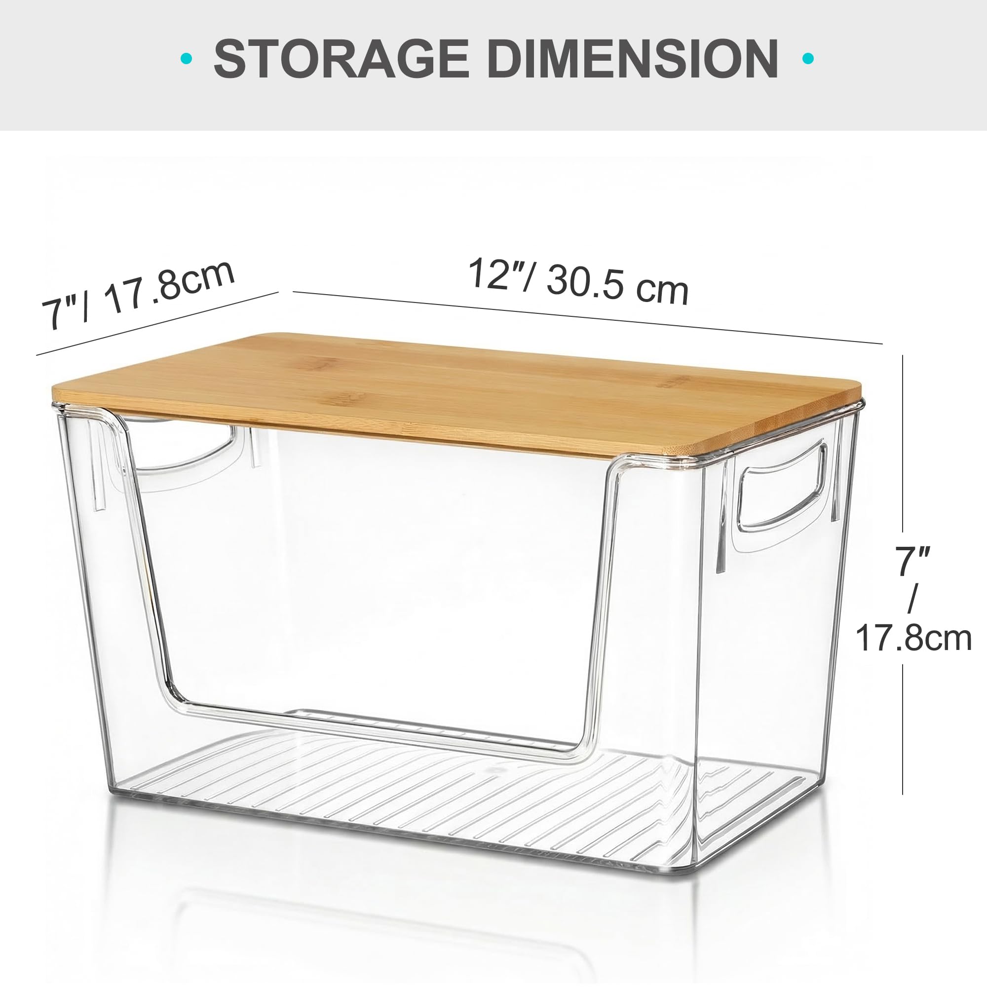 Pantry Organizers Storage: The acrylic bins measurements 12" long x 7" wide x 7" high. The overall height of our bin is 7 inches, making it suitable for most pantry cabinets and shelves.