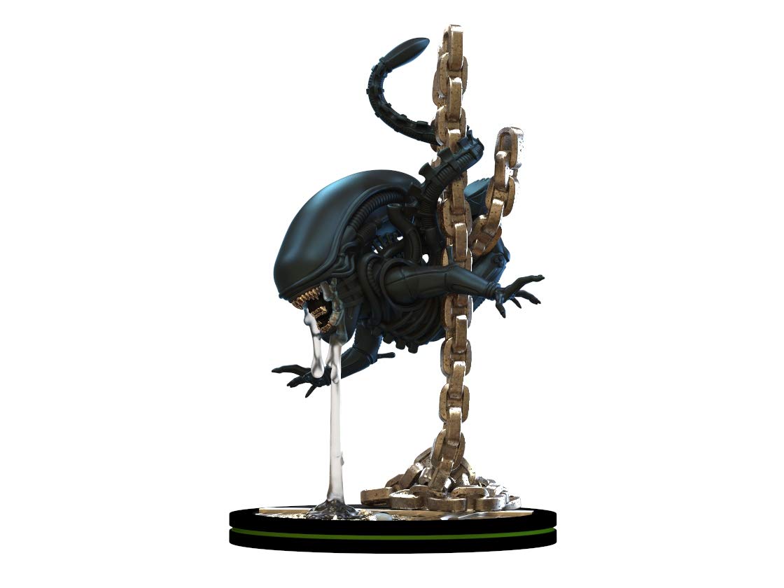 Our Xenomorph Q-Fig presents the ultimate predator as it descends a metal chain while hunting some very unfortunate prey.