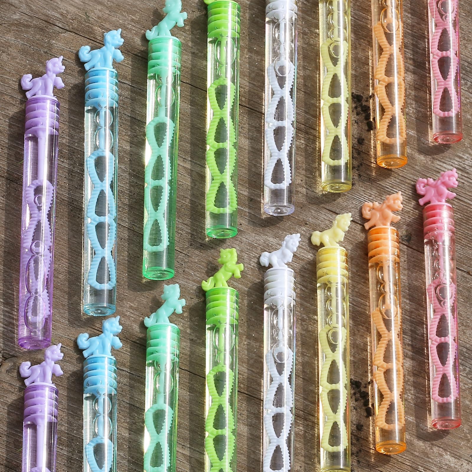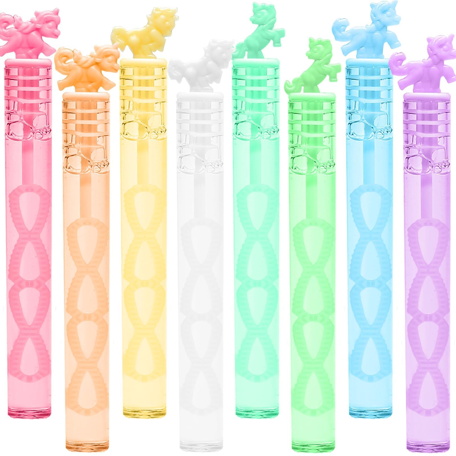 Bubble set, 8 different pastel unicorn horse design bubble wands (32 pack total). Each mini stick is 4.2 inches long(0.16 Fl Oz), small size for goody bag filler, little kids to catch and convenient to carry!