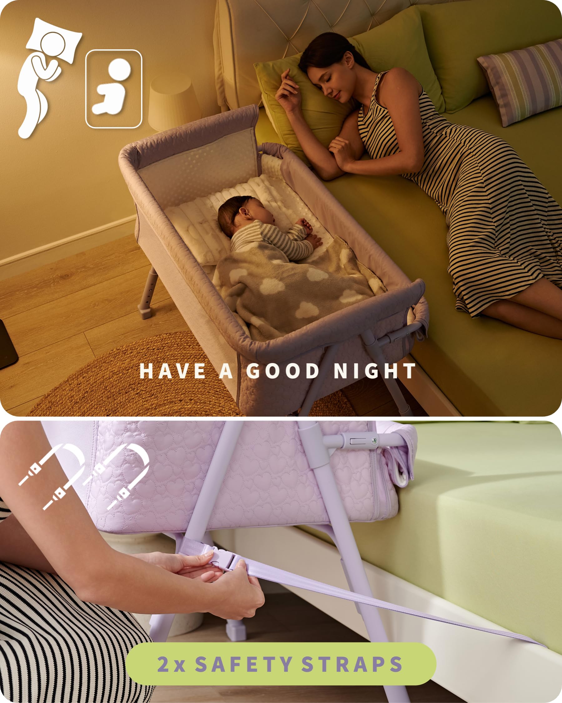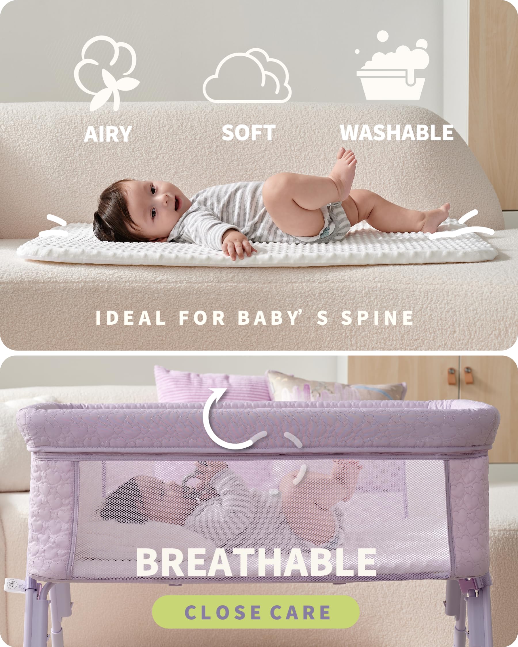 【BREATHABLE & COMFORTABLE|3D FLEECE MATTRESS + 2 SIDES MESH WALL】The AirClub bedside bassinet airy & soft mattress adapts a 3D FLEECE technique and snuggle dots covering all over it, providing a motherlike touch to baby and offers blissful levels of comfort to enjoy a peaceful, soothing sleep; Two-sided breathable mesh wall to maximize air circulation and improve visibility so that your baby will always sleep comfortably and you could keep an eye on the baby while reading, relaxing or doing your own business.