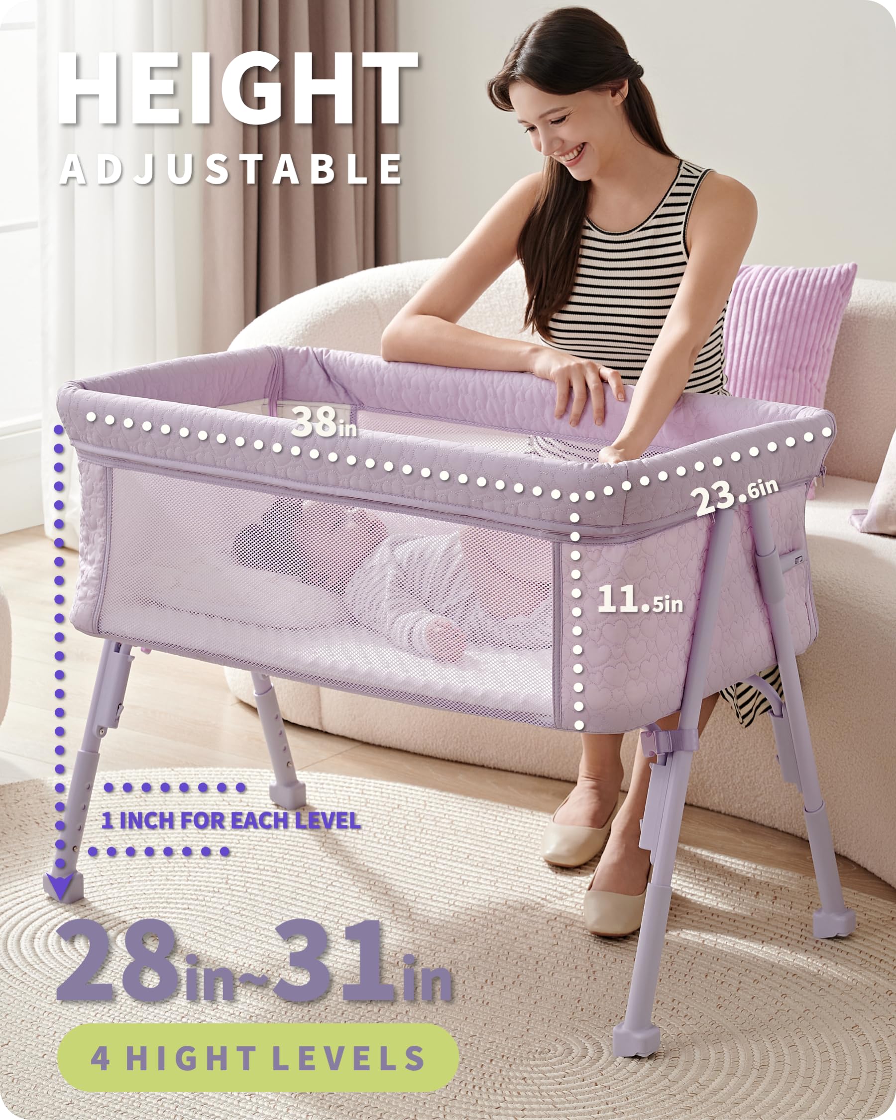 【COMPATIBLE WITH ALL PARENTS|4 LEVEL ADJUSTABLE HEIGHT】AirClub co-sleeper baby crib features 4 adjustment levels from 28'' to 31''(each 1'' apart)and can adjust this baby bassinets bedside sleeper according to the height of your bed. Meanwhile, you could adjust it to your preferred height in different scenes during the daytime, easier for you to care for your baby.