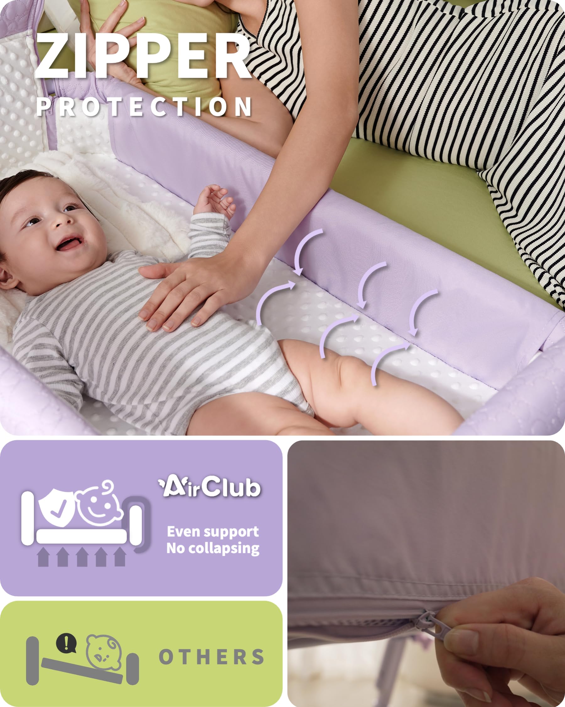 【RETRACTABLE SIDE|ZIPPER SCURED BEDSIDE SLEEPER】AirClub bedside bassinet for baby has a retractable side that can be UP/DOWN to provide direct access to your baby for a middle-of-the-night feeding, comforting, ideal for mum has C-section. The second layer bassinet bedside sleeper is secured by a zipper, making sure the second layer won't collapse to one side.