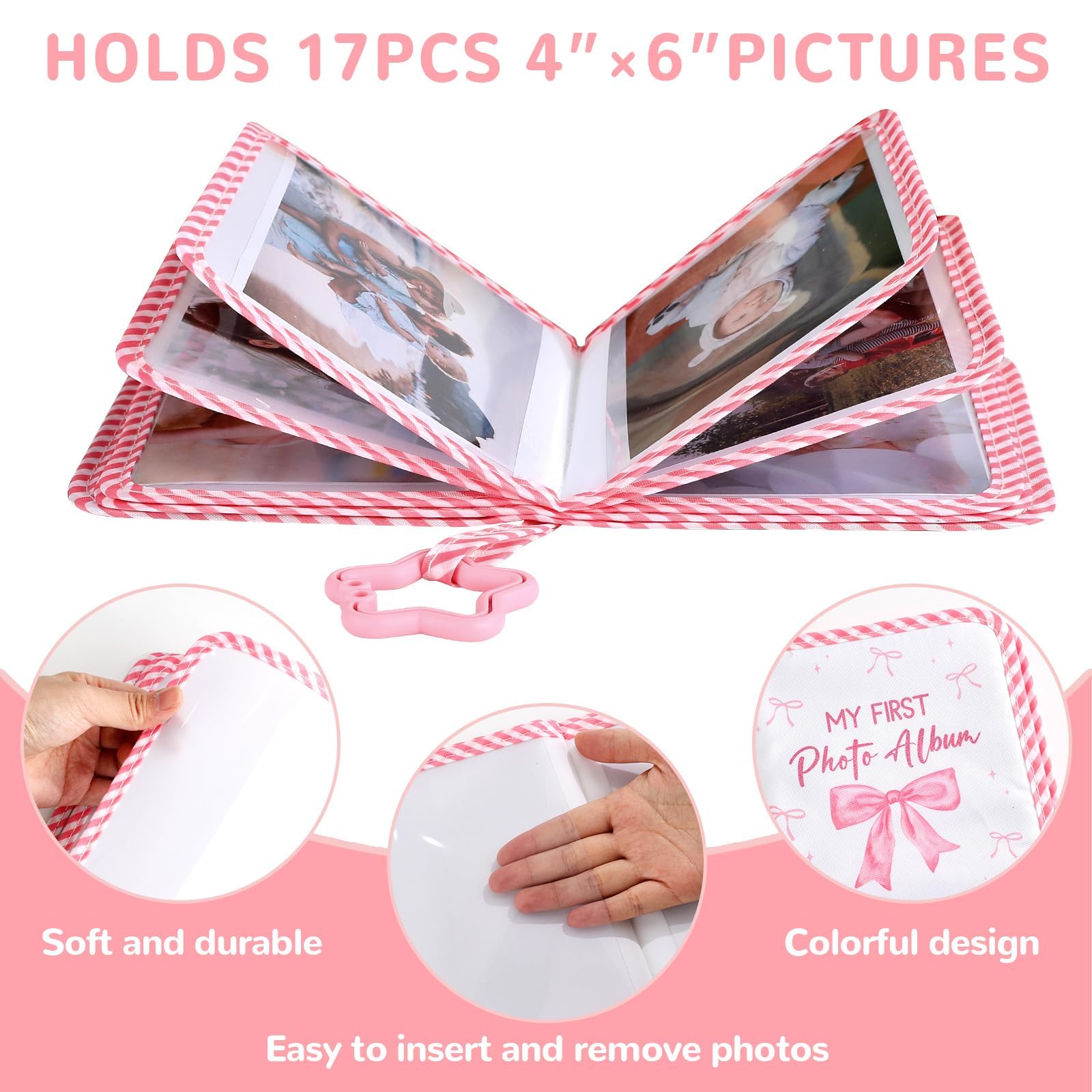 Super value pack: This pink bow first family photo album is designed to hold up to 17 sheets of 4x6 inch photos, making it the ideal baby photo album to capture your little one’s milestones. With secure hooks for hanging and a small mirror on the back, it's a delightful addition to your baby scrapbook collection.
