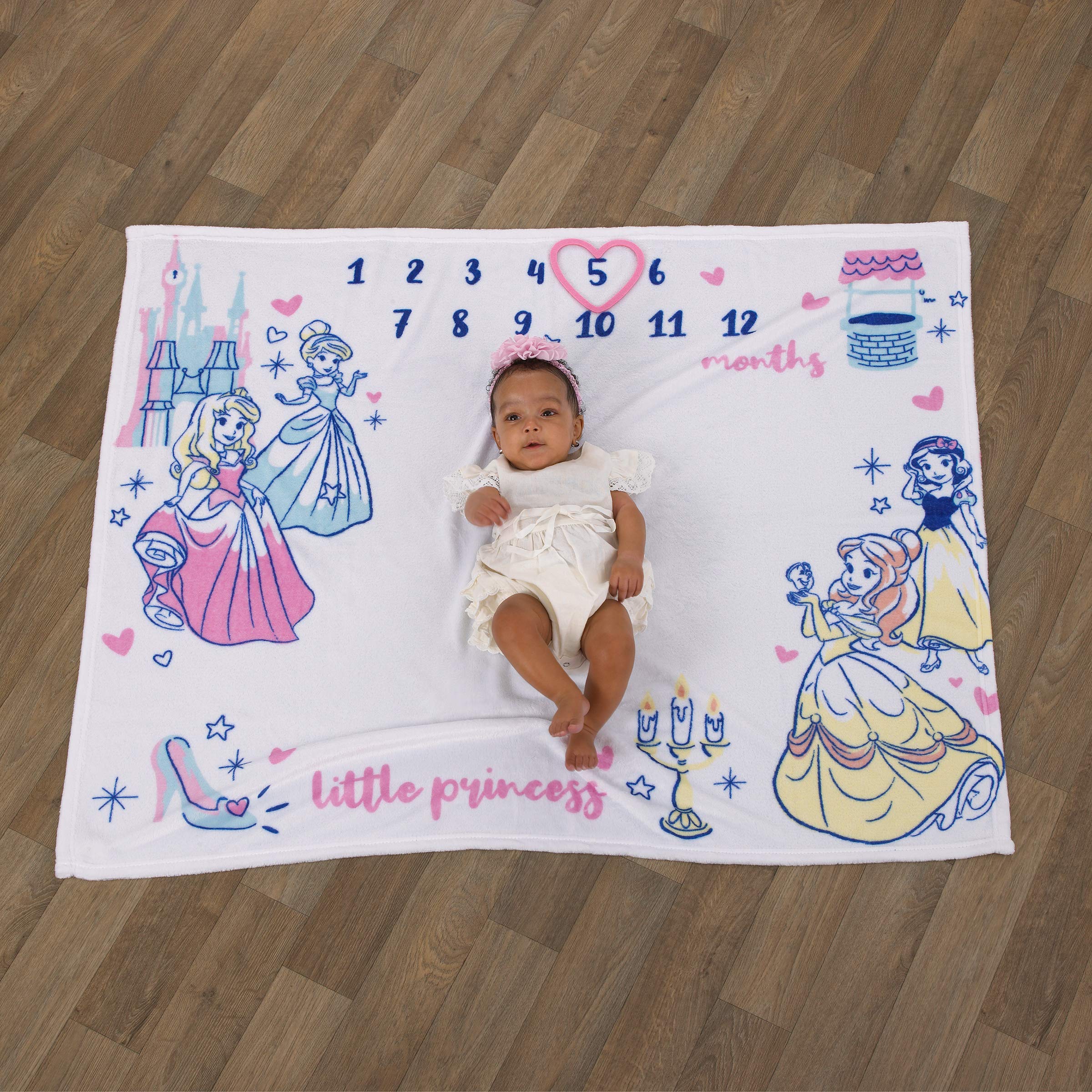 This blanket is designed to create the perfect photo opportunity and capture milestones for each month. Document baby's progress as they grow. Includes a heart shaped felt cutout to place on each month. Made of soft plush fabrics and measures 40" X 50". Featured in shades of pink, white, aqua and yellow. Princesses Cinderella, snow White, arora and Belle are enchanting. With saying, "little princess". Makes a wonderful keepsake gift.