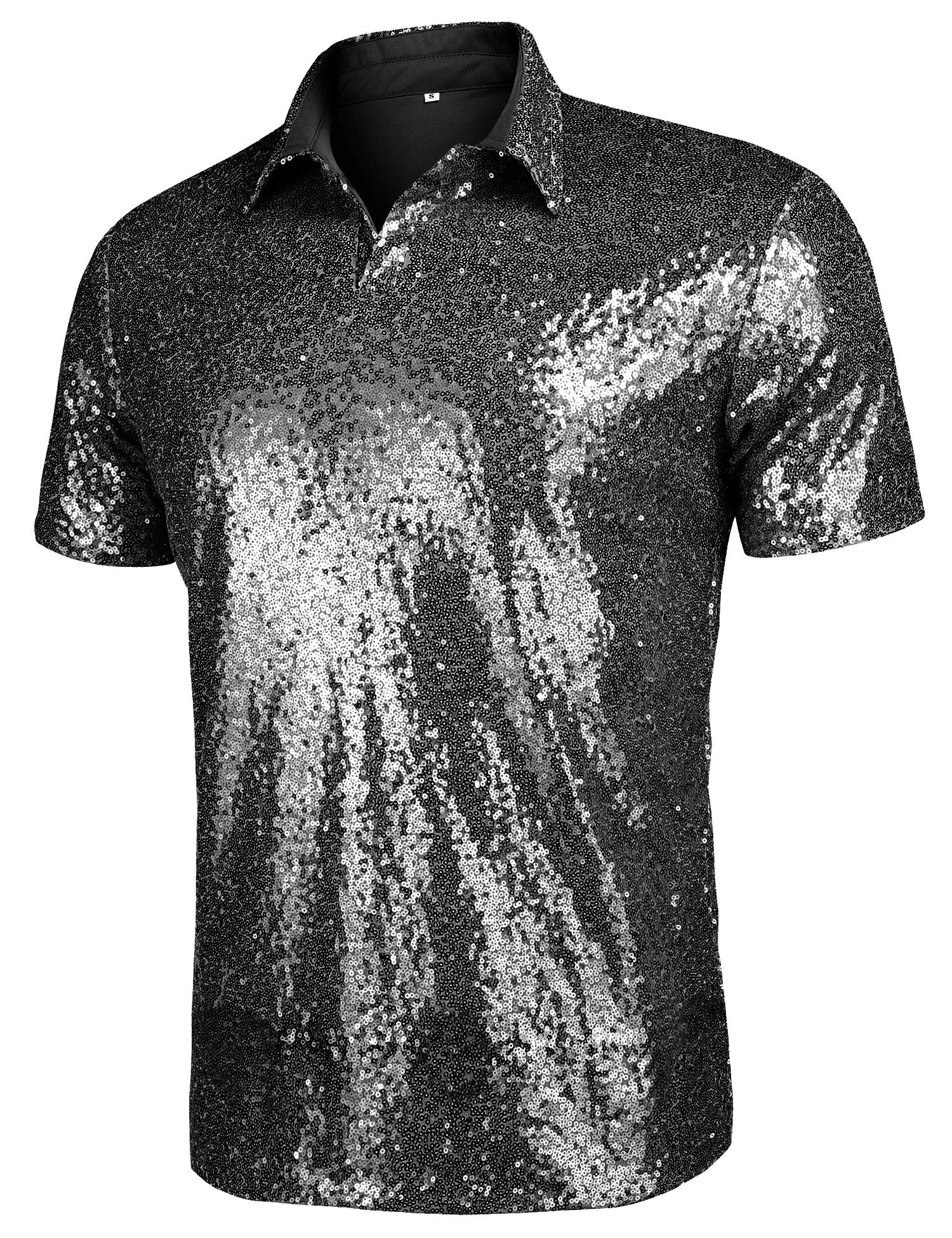 Unique Design: Our sequin disco polo shirt features a double-layered design that includes a sequin-covered outer layer and a full mesh-lined inner layer. The mesh layer provides added comfort and protects the skin from scratching, while the full sequin layer decoration adds a sparkling and shimmering effect