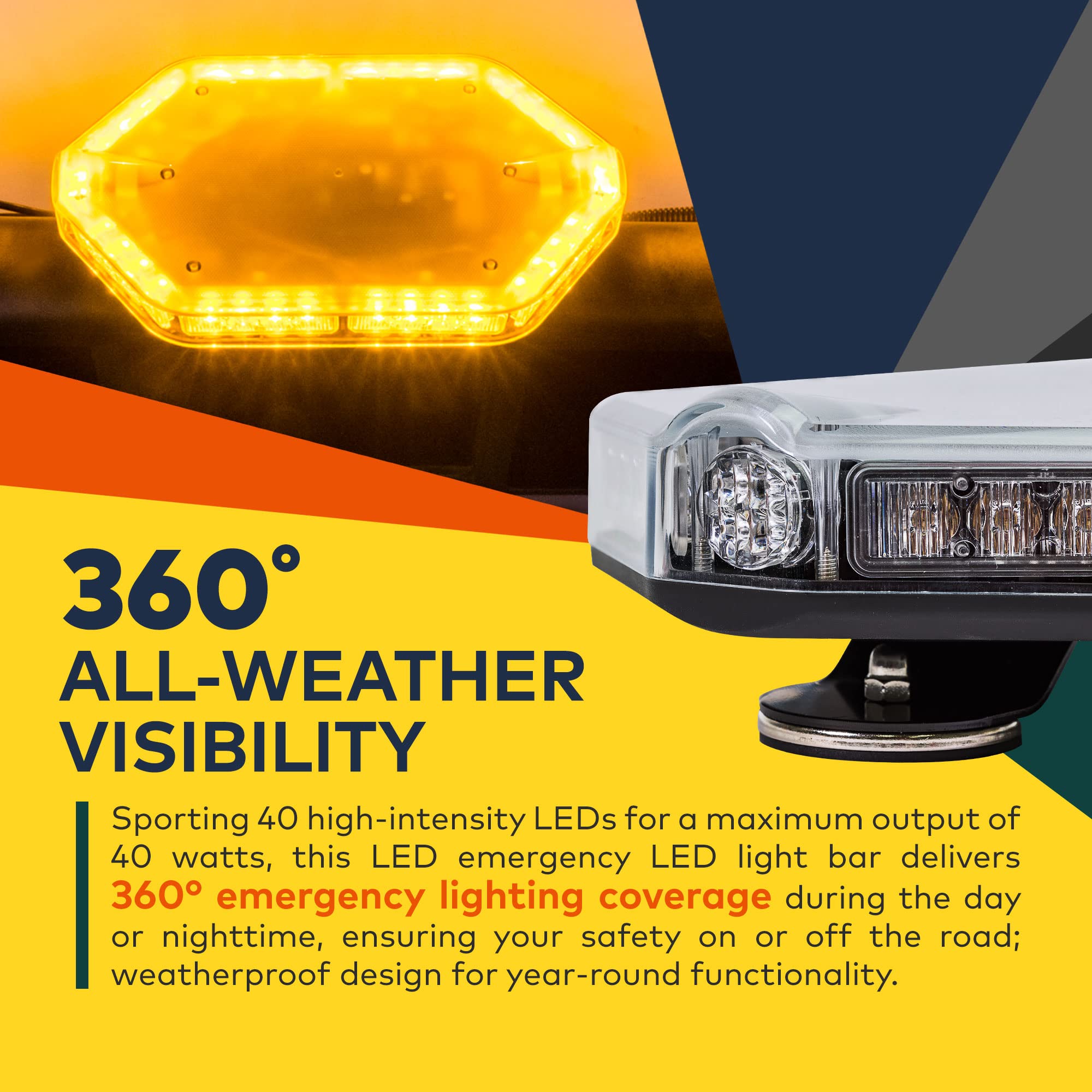 ALL-WEATHER VISIBILITY- Sporting 40 high-intensity LEDs for a maximum output of 40 watts, this SAE Class 1 rated LED emergency light bar delivers 360° emergency lighting coverage during the day or nighttime, ensuring your safety on or off the road; weatherproof design for year-round functionality.