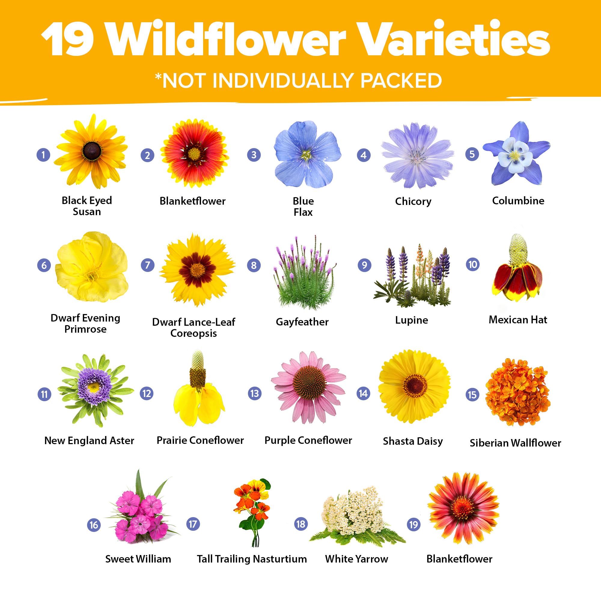 PREMIUM VARIETY MIX: Create vibrant gardens with nineteen wildflower varieties; Perfect perennial and annual flower seeds for planting outdoors; Includes Black Eyed Susan, Blanketflower, and Blue Flax; Drought tolerant wildflower seeds thrive in diverse soils