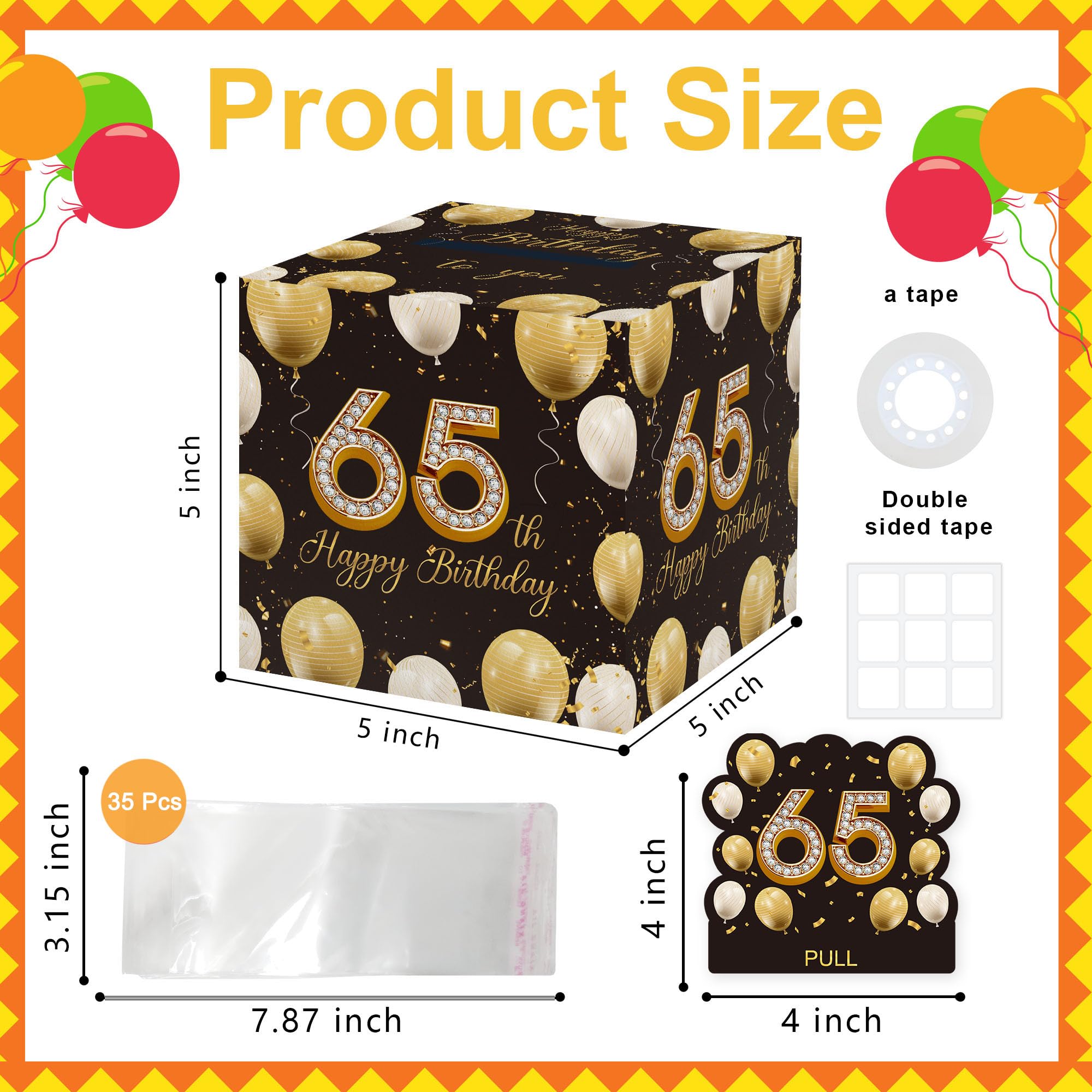 Surprise Gift Box: this gift box measures 5x5 inches, is made of durable cardboard. It also includes 2 theme-related shaped card(with adhere glue dots), 1 roll of transparent tape and 35 plastic pouches similar to the size of U.S. currency for easy placement of bills.