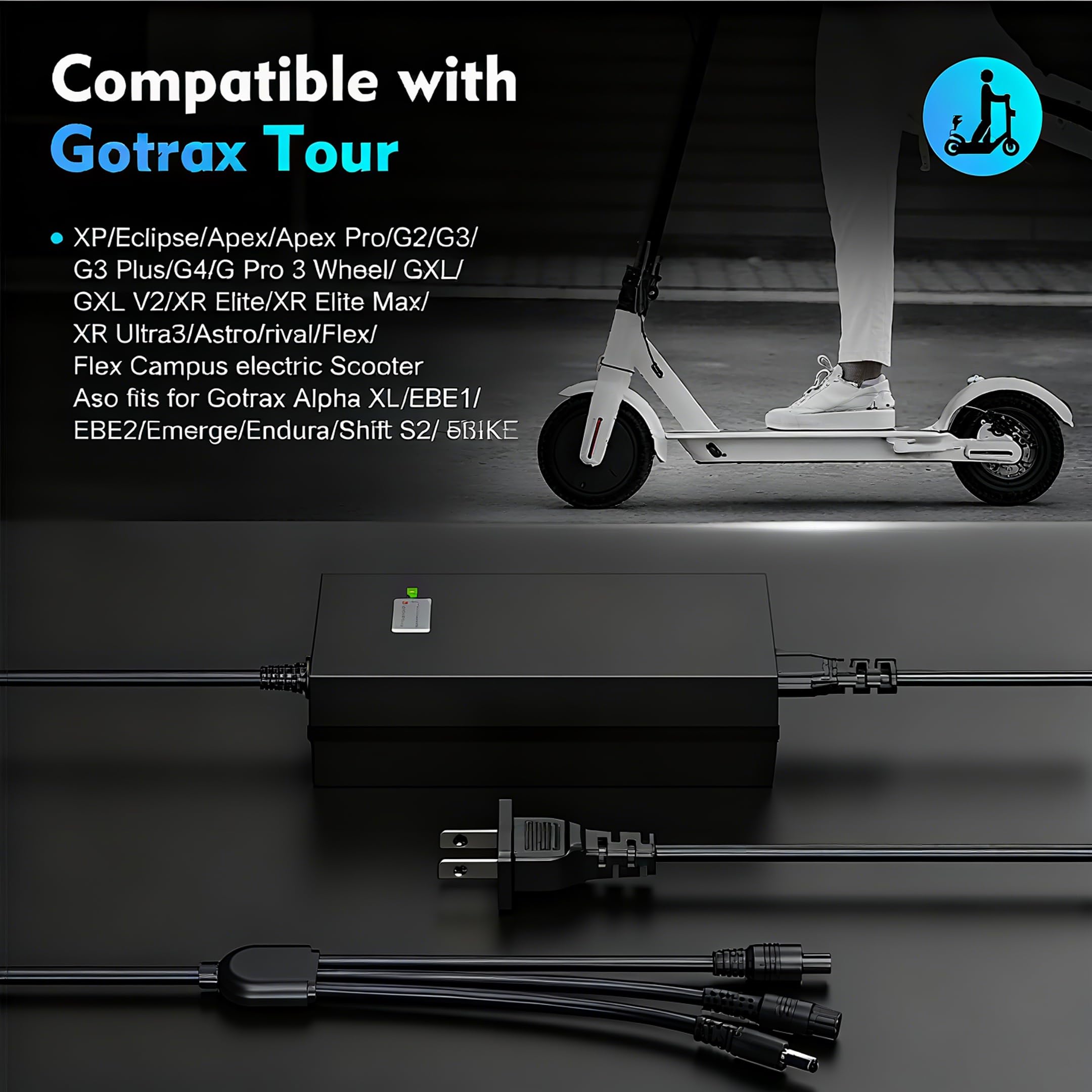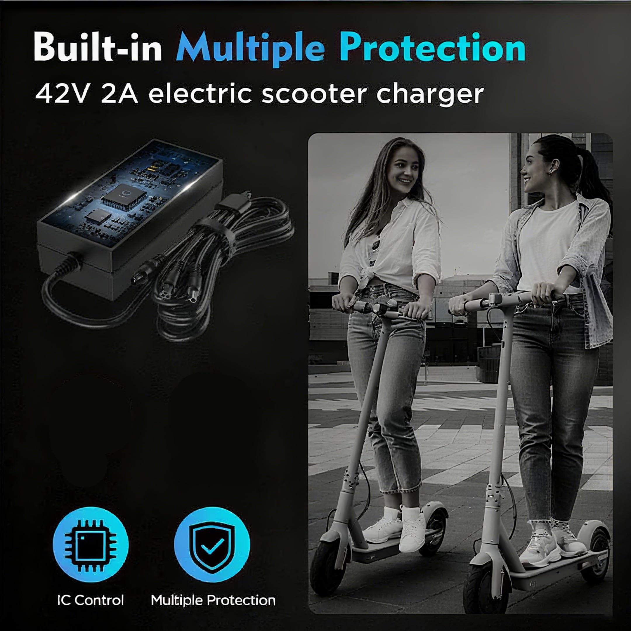 Replacement for 36V scooter bettry charger Specification:Input Voltage: 100-240VAC 50/60Hz, Output: 42V 2A, Features 0.31-inch inline connector, 9.84ft long power cord