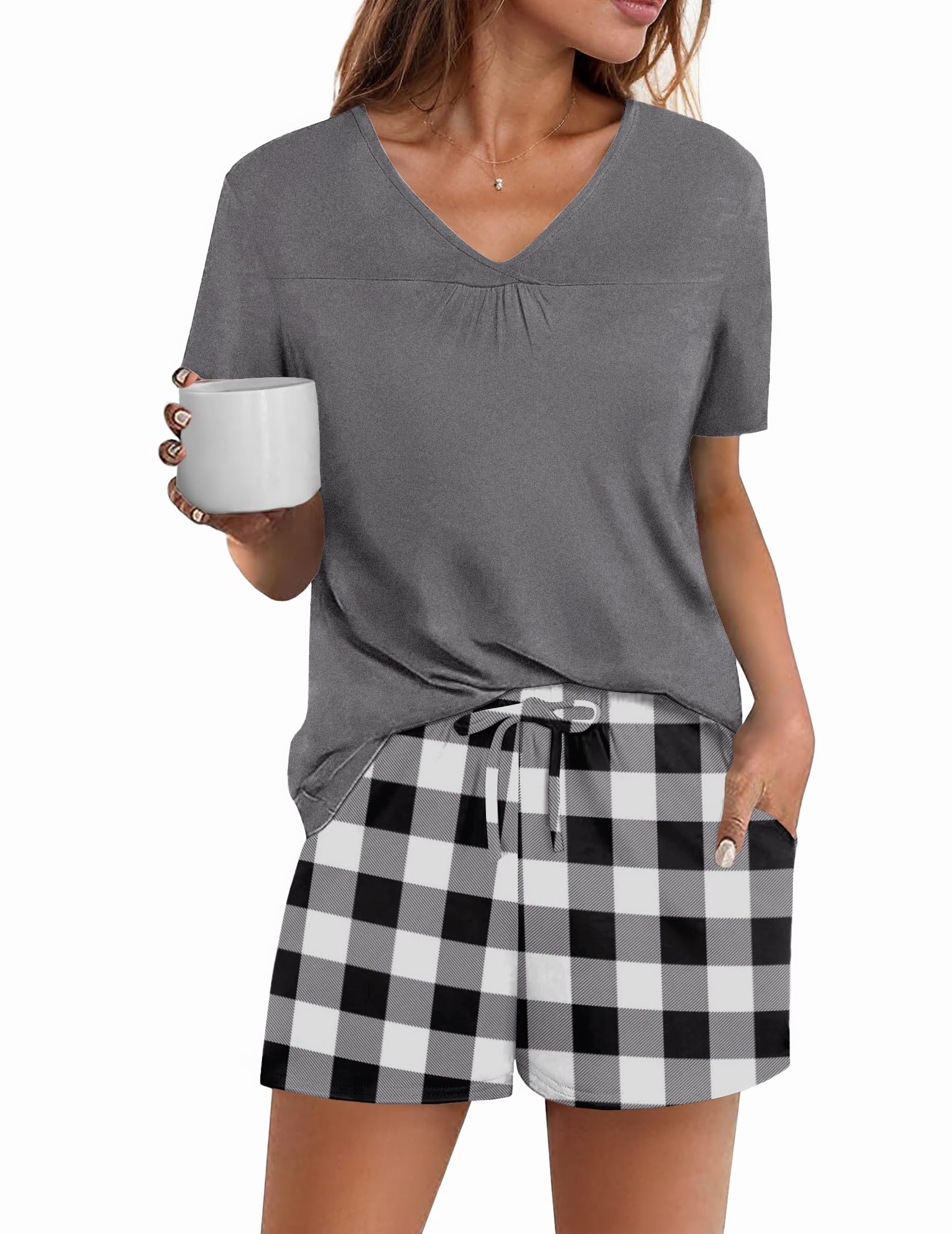 This soft pajama top features V neck, short sleeve, pleated front neckline,and the comfy modal pajama shorts is designed with elastic waist, drawstring and thigh-length