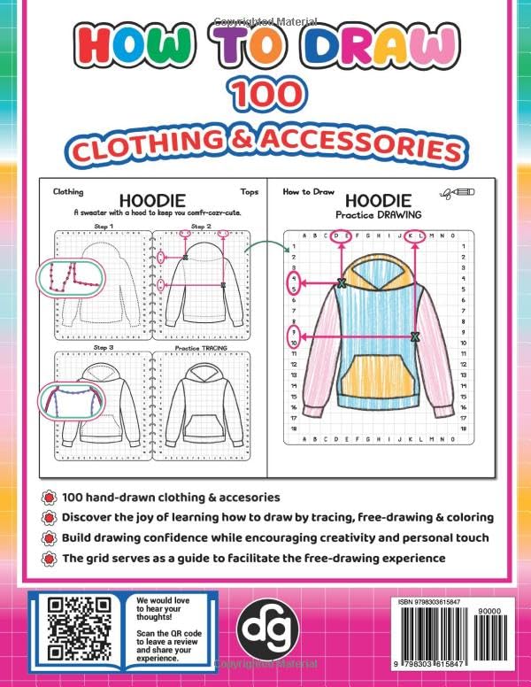 Discover the Modern Fashion Drawing MagicwithHow to Draw 100 Hand-Drawn Clothing & Accessories! Introduce your kid to modern fashion world with this easy-to-follow step-by-step how to draw book designed to facilitate learning tracing, free-drawing experience and coloring, while boosting their sketching, imagination, and coloring skills. Book Specifications 100 unique hand-drawn designs of clothing and accessories, including a short description of each item (tops, bottoms, one piece, footwear, outerwear, hats, underwear, sleepwear, jewellery, accessories, miscellaneous) Dedicated grid pages to practice free-drawing and coloring Build drawing confidence while encouraging creativity and personal touch details including coloring kid’s drawings Awesome gift for kids (girls, teens) who wish to learn how to draw fashion items and sketch their own stylish illustrations to build their own portfolio as a future fashion designer Happy Drawing!