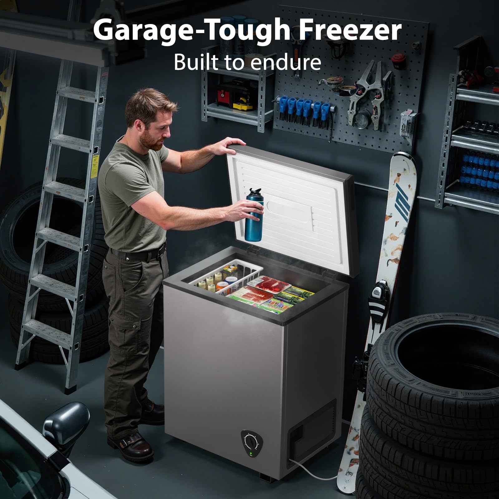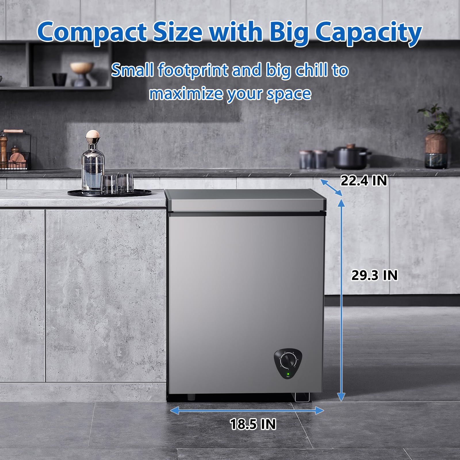 【Compact Design with a Big Capacity】:Product dimension: 18.5”(L)x22.4”(W)x 29.3”(H) and 3.5 cubic ft, the deep chest freezer is compact enough for the modern home or business while spacious enough to store sizeable amount of daily food. It comes with one removable storage baskets that helps you to organize the food in easy reach