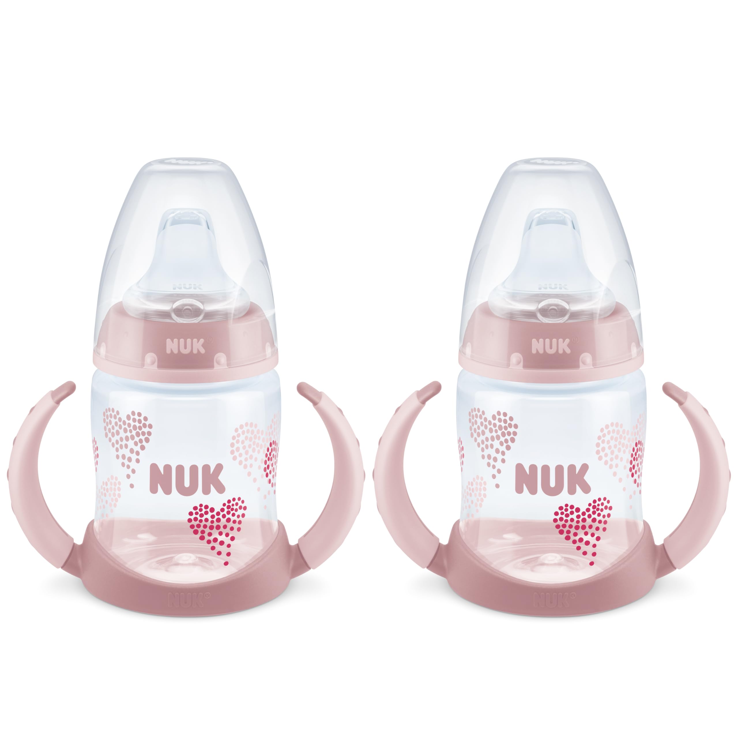 The NUK Learner Cup easily promotes baby’s transition from breast or bottle to sippy cup. This Learner Cup features a spill-proof soft spout that is gentle on teeth and gums, and it includes an air vent that helps reduce swallowed air. The cup also comes with easy-to-grip, removable handles that your growing child will love. NUK Learner Cups are BPA free and dishwasher safe. Our 10 oz Learner cups are recommended for ages 8m+.