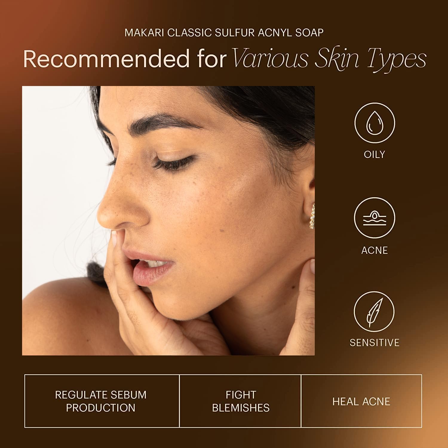 FIGHTS ACNE AND PIMPLES: Makari Classic Acnyl Sulfur Soap is an anti-acne bar soap that helps you get rid of acne, pimples, whiteheads, and blackheads. It helps unclog pores and control the production of face oils.