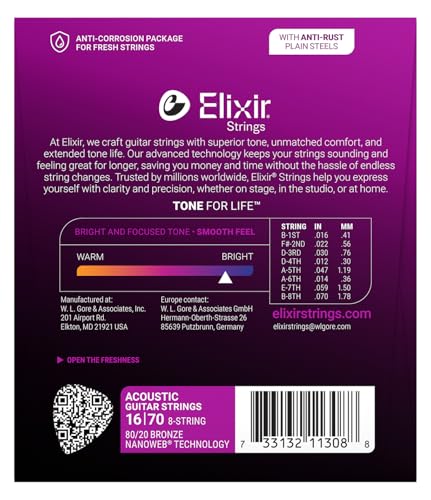 CONTENTS: 1 x Elixir Strings, Acoustic Guitar Strings, 80/20 Bronze with NANOWEB Technology, Longest-Lasting Bright Tone For Life with Comfortable Feel, 8-String Set, Baritone For Life 16-70