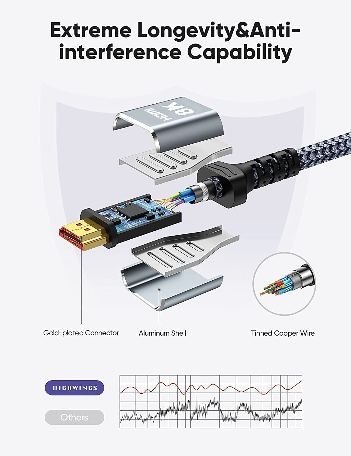 UHD 8K HDMI Cable 2.1 : Highwings 8K Ultra High Speed HDMI 2.1 Cable uses the most cutting-edge technology, is compatible with 8K@60HZ and 4K@120HZ, clearly displays every paricle, and accurately processes every signal source