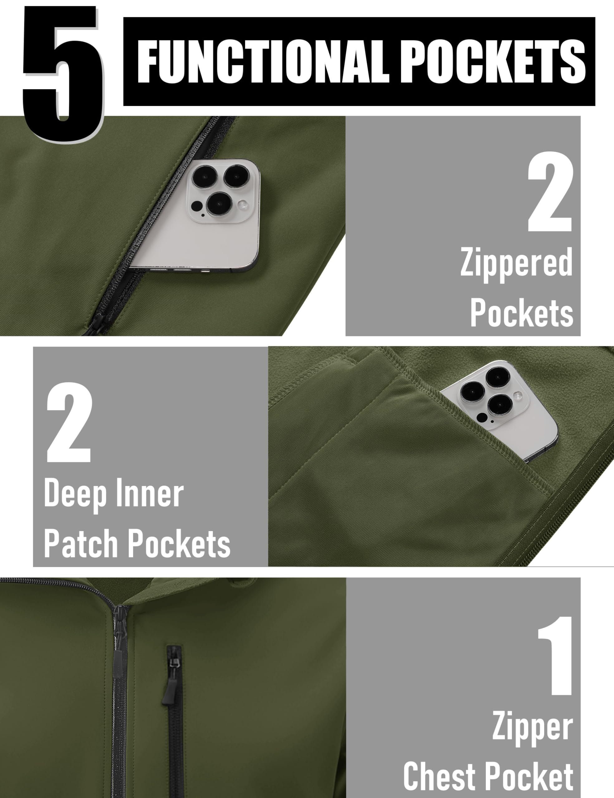 5 FUNCTIONAL UTILITY POCKETS - Men's tactical hiking jacket includes 2 inside roomy pockets, 2 zipper hand pockets and 1 zipper chest pocket, providing great convenience for storing money, keys, phone, wallet etc