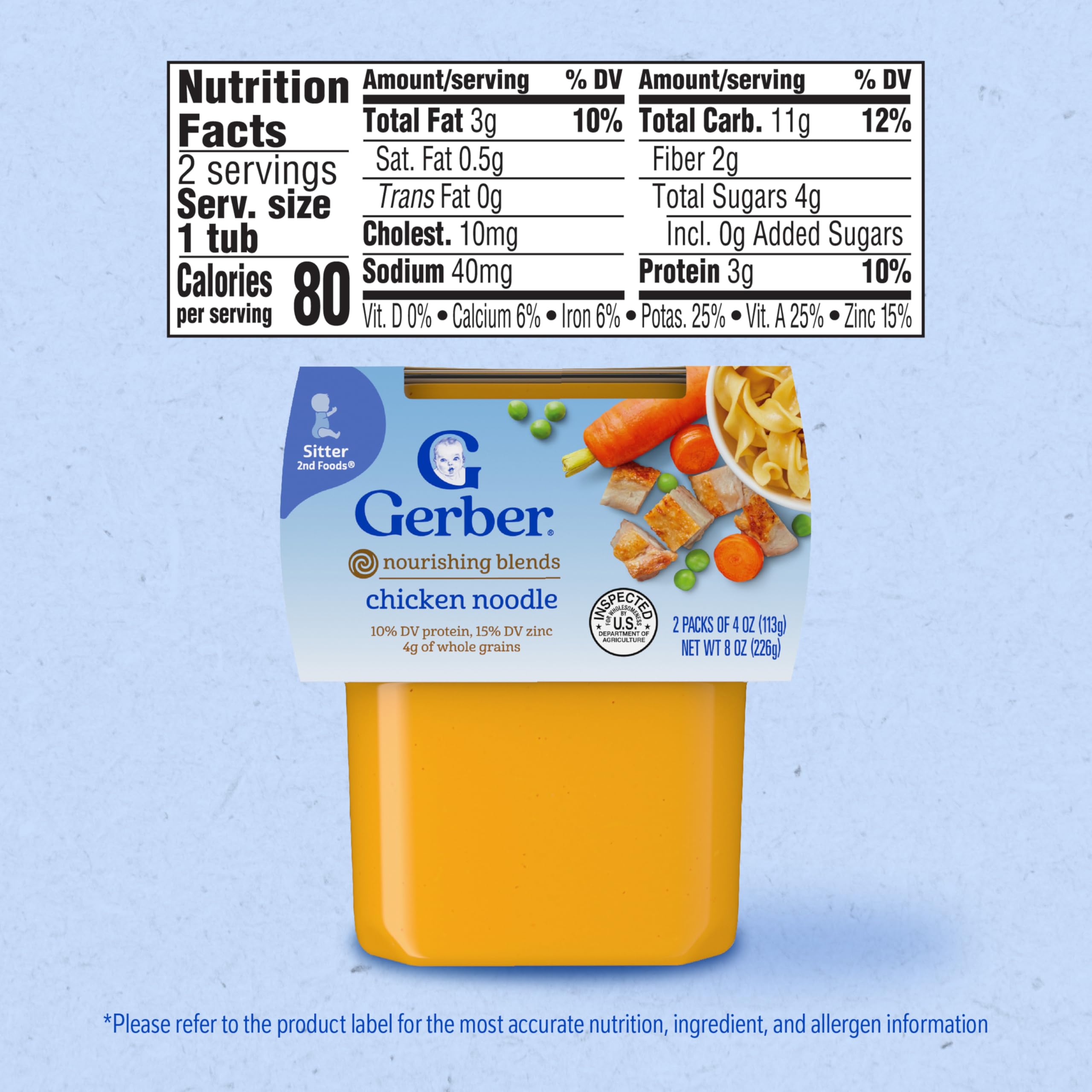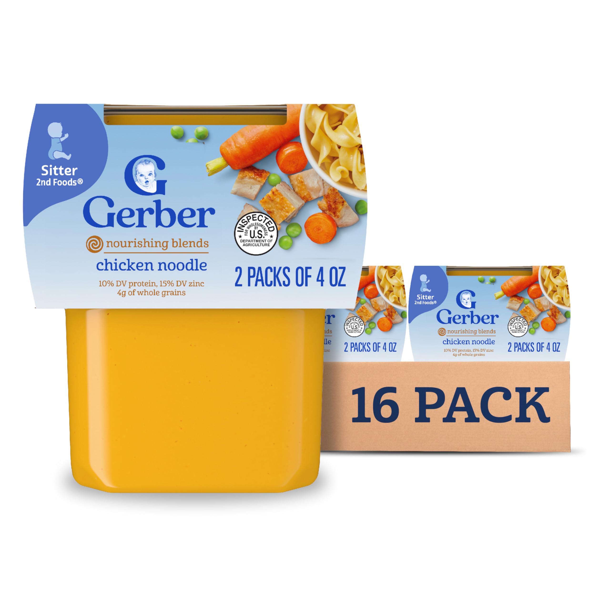Gerber Stage 2 Baby Food, Chicken Noodle Puree Tubs are a premium choice for your child’s early stages. They are crafted to support a varied diet, along with meeting the busy lifestyle needs of caretakers and parents. Each baby puree tub comes in a portable, easy-to-store format – making it perfect for life’s busy moments. This stage 2 baby food puree is designed for babies who are ready to start introducing new textures and flavors into their diet. Gerber understands the importance of providing wholesome ingredients during the crucial developmental stages of your child's life -- that’s why these baby puree tubs are ideal for parents who seek a convenient and high-quality option in their baby's diet. These tubs need to be refrigerated after opening and must be used after 1 day.