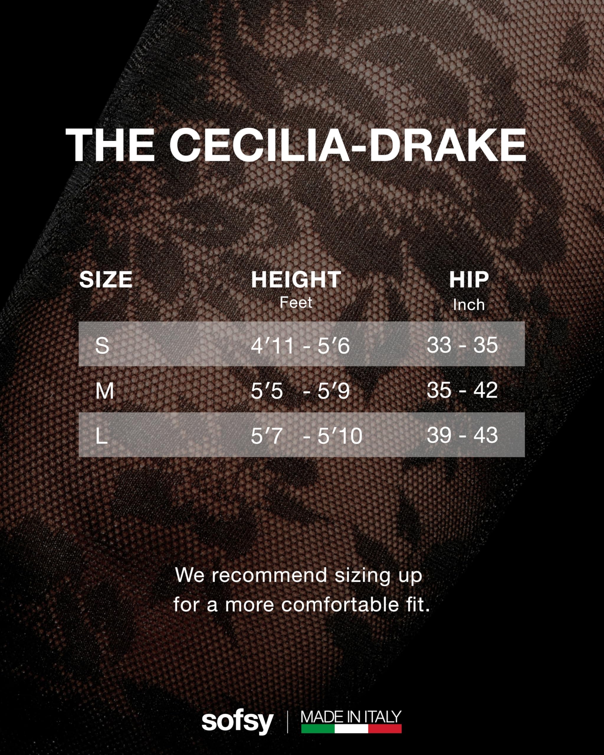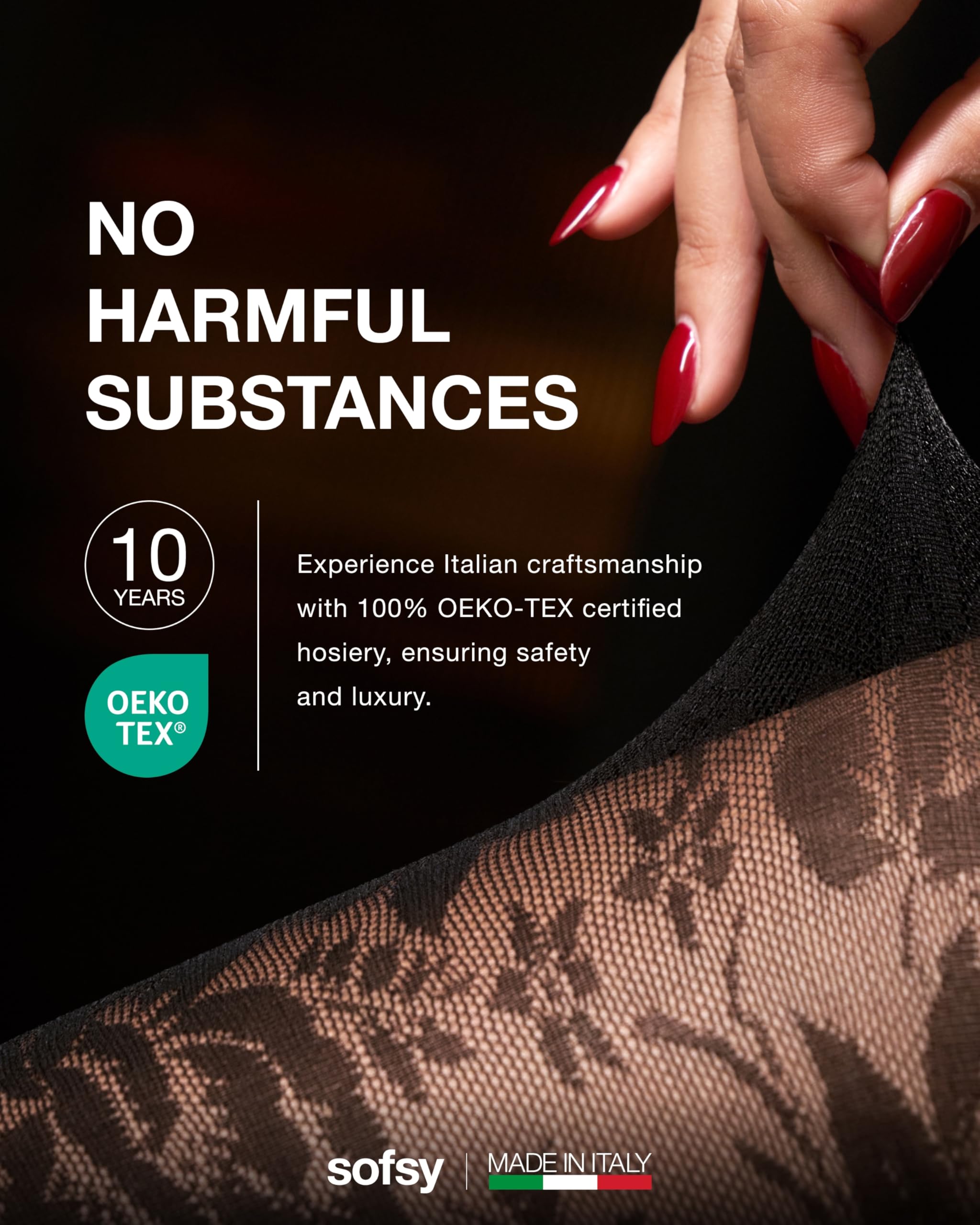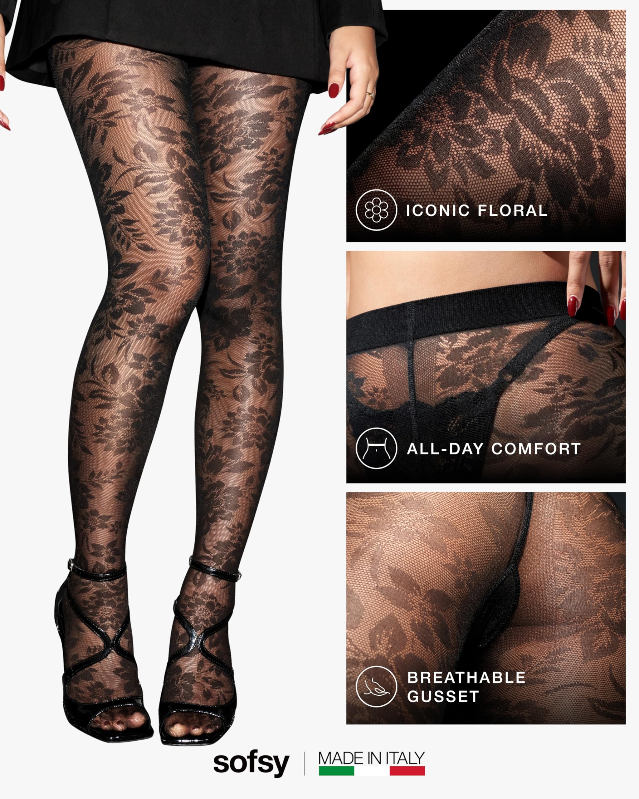 Description Elevate your style with sofsy’s Italian-Made Patterned Tights — where timeless elegance meets everyday versatility, backed by customer-loved comfort and lasting quality. Designed for women who value both beauty and function, our collection includes lace tights, floral tights, diamond patterned tights, and patterned fishnet stockings for women, each crafted in Italy with over a decade of hosiery expertise. Every pair is made from premium, OEKO-TEX certified nylon–elastane blends for a buttery-soft, breathable feel and true-to-size fit that stretches comfortably without digging or rolling. The all-day stay-up high waistband smooths and flatters, while reinforced toes and quality knitting deliver durable, rip-resistant wear that holds up through dancing, layering, and everyday movement. Choose from delicate floral lace tights, bold fishnet patterns, chic diamond designs, or opaque tights with designs — each one finished with intricate patterns exactly as pictured. Whether it’s lace stockings for women sexy enough for date nights, rose tights for a romantic touch, or black tights with designs for sophisticated workwear, sofsy patterned tights adapt seamlessly to every wardrobe moment. Perfect for office wear, party outfits, costumes, and casual styling, these tights pair effortlessly with dresses, skirts, or shorts. With luxurious Italian craftsmanship, inclusive sizing from XS to Large, and versatile patterns, they’re more than an accessory — they’re a style investment you’ll reach for season after season.