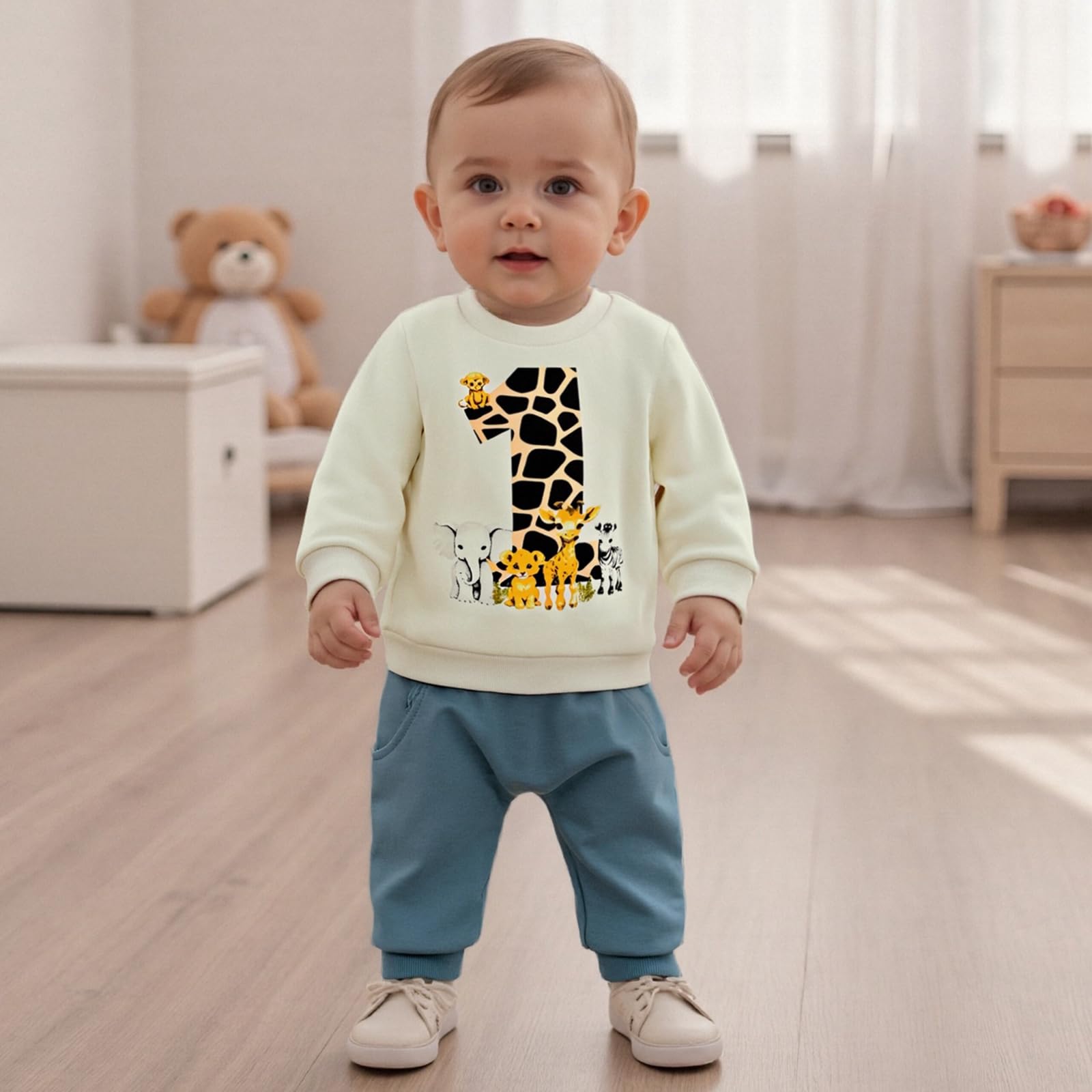 Design: First birthday outfit boy, my first birthday boy outfit features wild one number animal print, long sleeve baby crewneck sweatshirt and elastic waist solid pockets pants, super cute and trendy sweatsuit for spring,fall and winter casual wear
