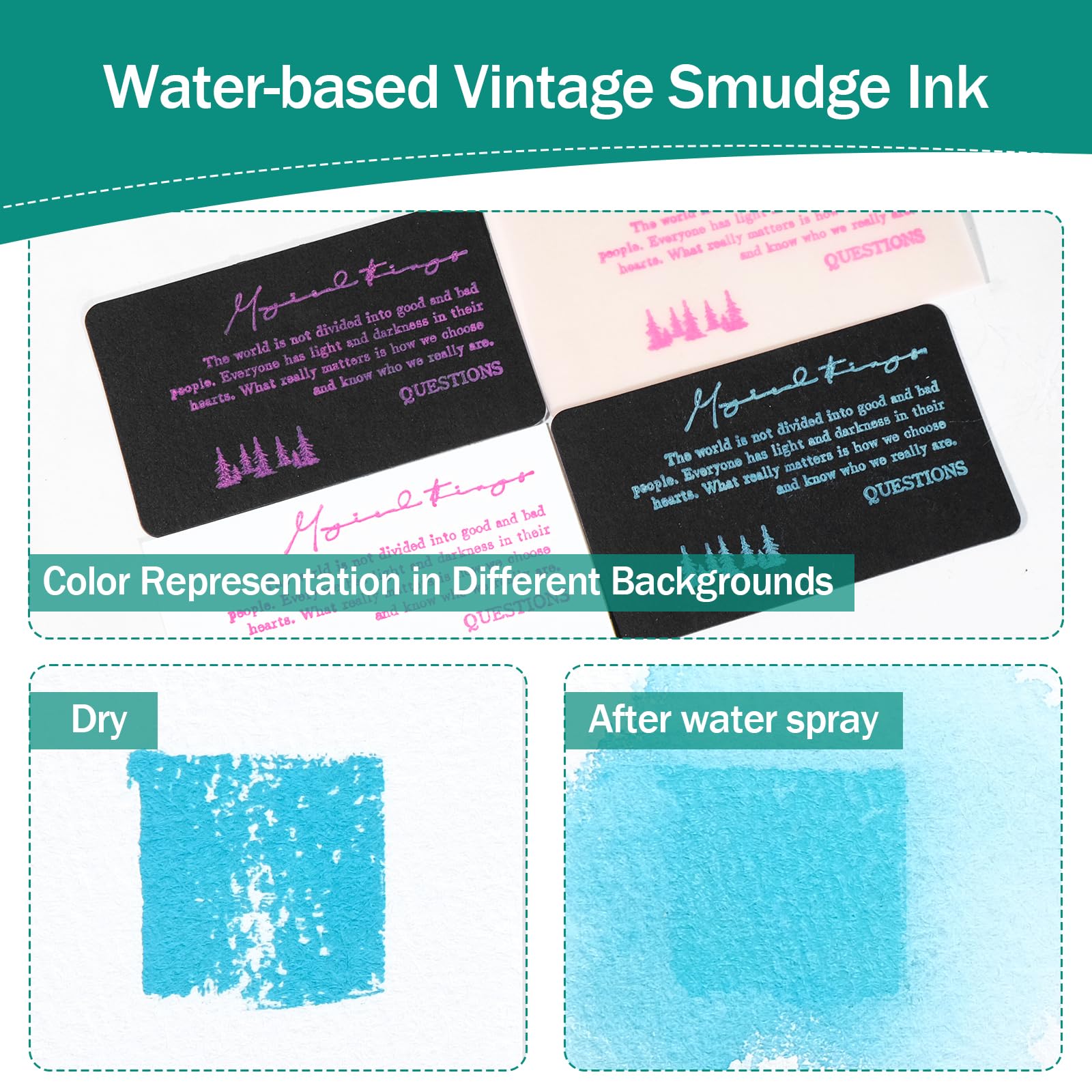 【4 Colors Smudgeable Chalk Ink Pad Set】CraftyManor Masked Impression stamp ink pad features a powdery texture that delivers exceptional coverage, maintaining vibrant color performance even on dark backgrounds. Simultaneously, the ink naturally bleeds when exposed to water, creating a mottled, vintage-inspired effect. These dual characteristics lend a rich layered quality to projects created with this rubber stamp ink pads
