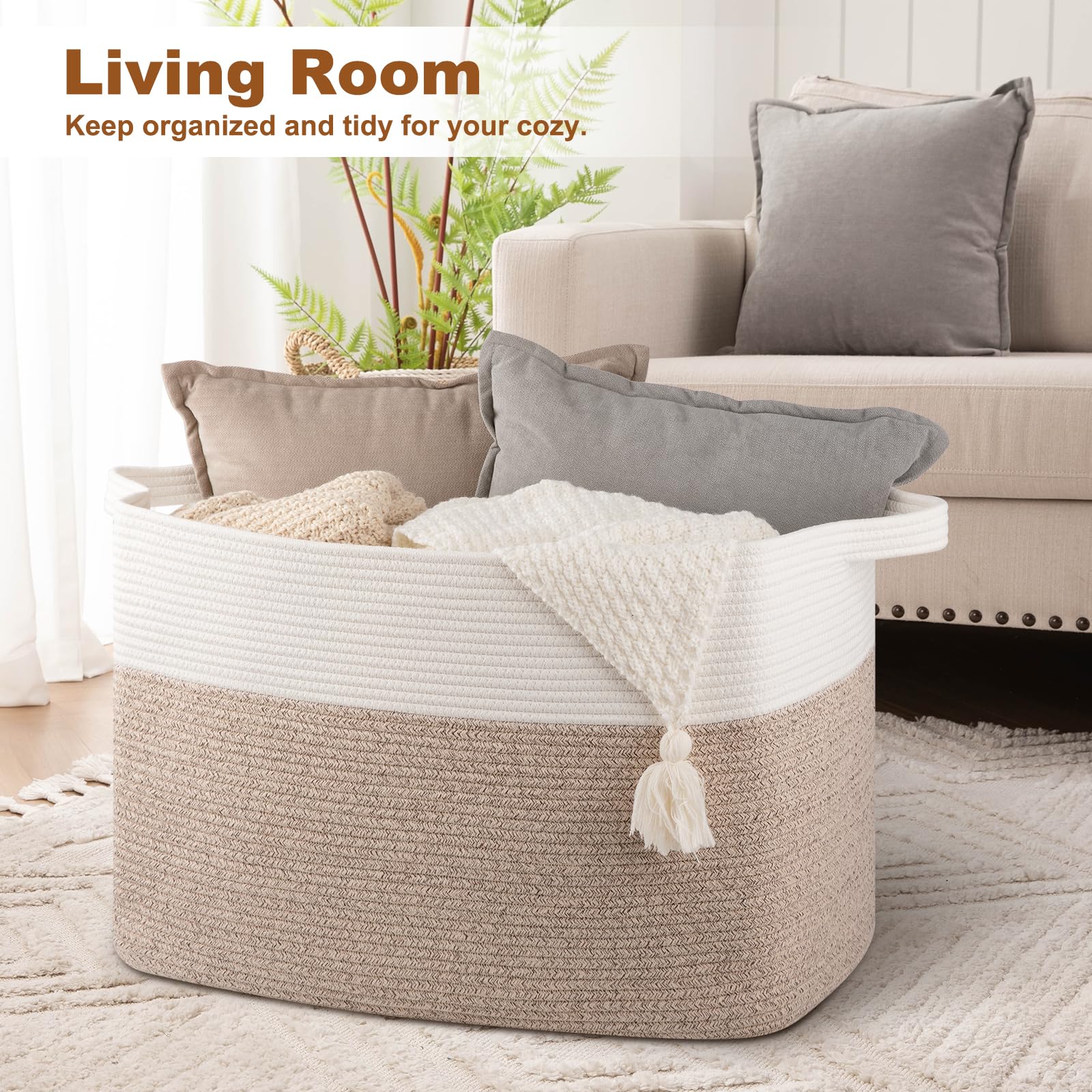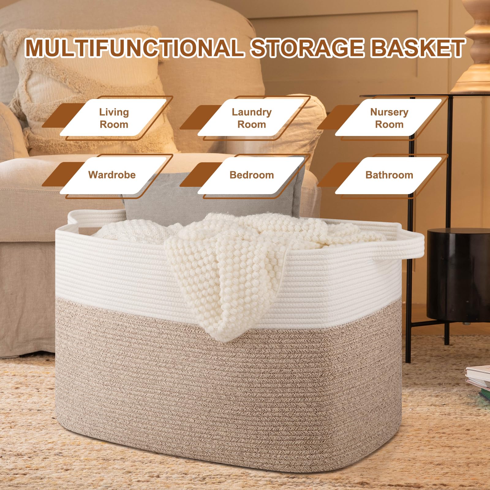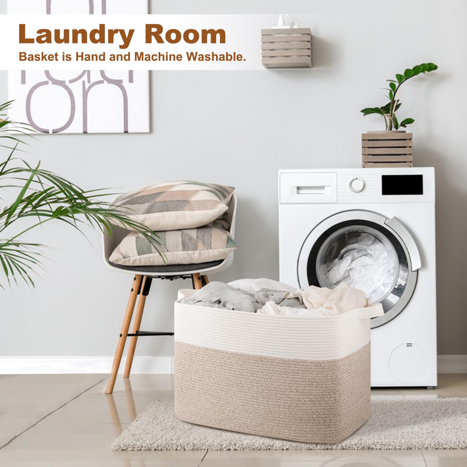 Premium Cotton: The large storage basket is Crafted from 100% cotton rope, making it a soft, textured big basket that'll look great in living room, bedroom, kids room, laundry room and nursery. The rope basket is safe to baby for no unpleasant chemical smells. No hard edges will keep your floors and walls free of scratches.It is more durable than plastic basket