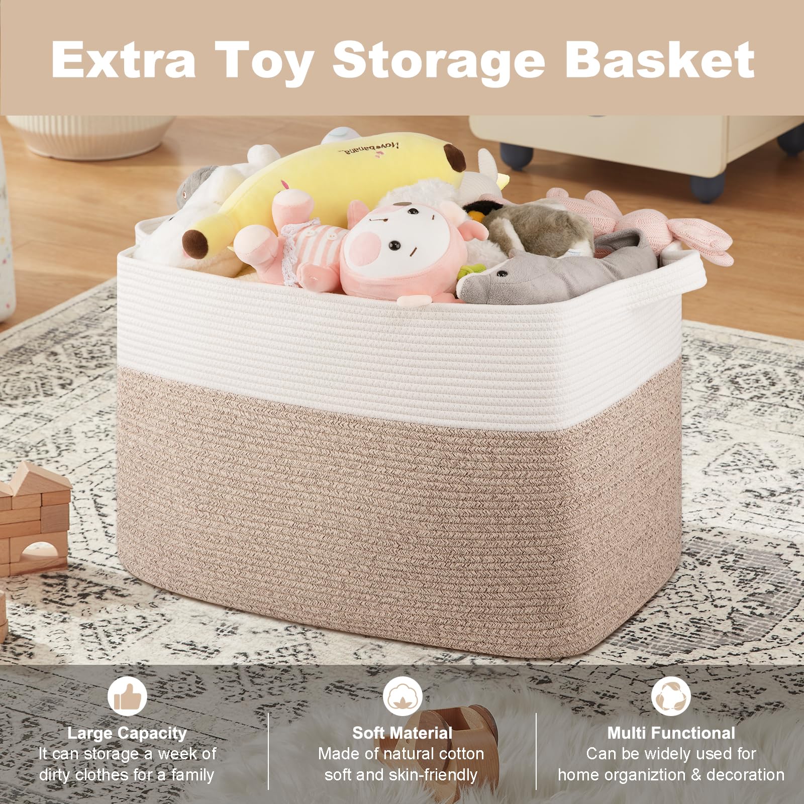 Multi-Purpose Solution: Many people are stocking these extra large basket to organize pillows, blankets,clothes, magazines, diapers, toys or towels, The rectangular big toy storage compared to similar products are more suitable for keeping your everyday home life more organized