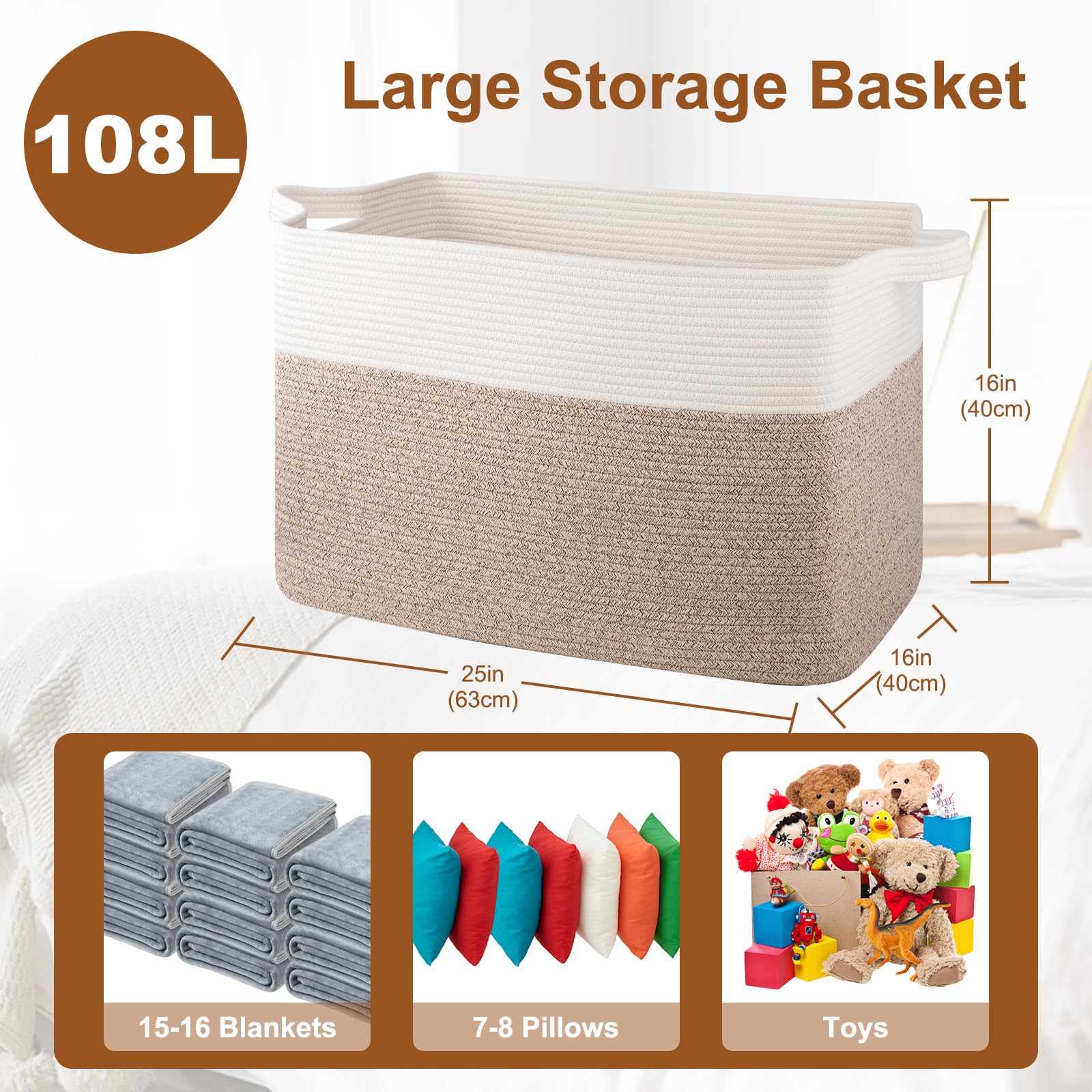 Super Large Blanket Basket: The size of our extra large basket is 25" x 16" x 16". This rectangular blanket basket is more stable and easier to restore its shape after you receive the package.Giant rectangular floor basket offer accessible blanket storage for living room and bedroom. This huge space-saving blanket holder has an 108 liters capacity and can hold tons of blankets and other bedding