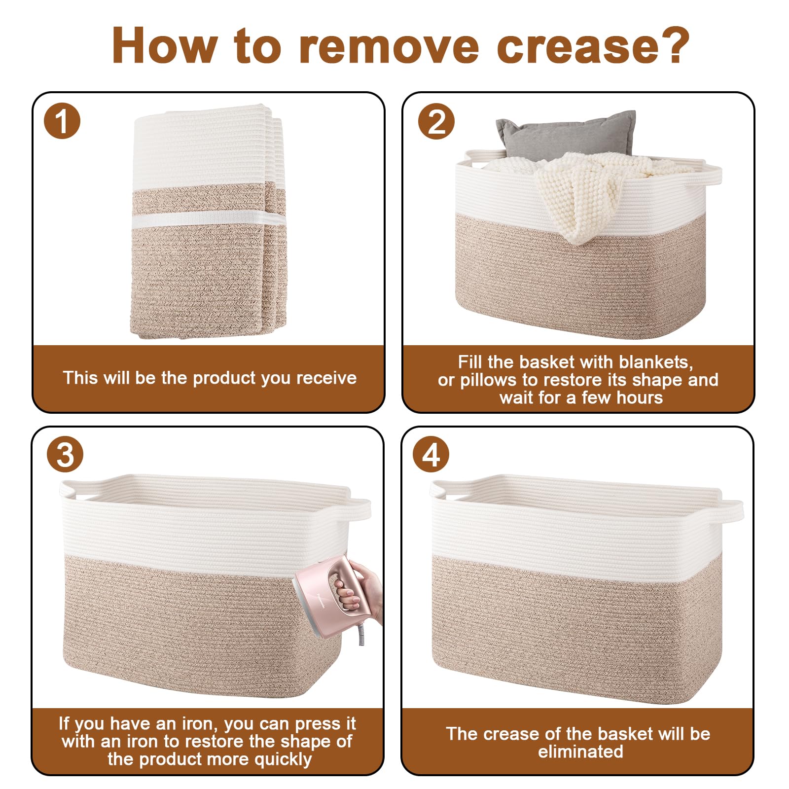 Note: The cotton woven basket are folded for shipping. Filling it up with towels or blankets could help it return to its best shape. Fast smoothing the creases by ironing them. The rope basket is hand and machine-washable. It's built for long-term use