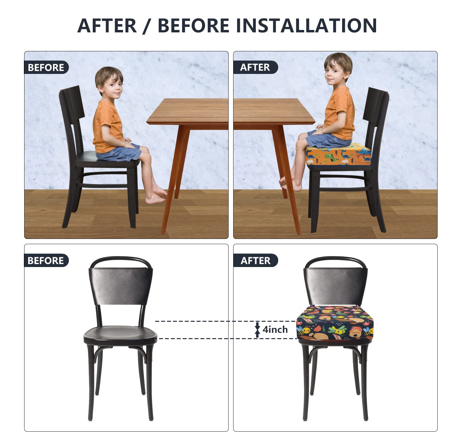 【Safety & Installation】-Two adjustable belts on the cushion suitable Heightening dining table seat of different sizes chair.The bottom of cushion has compact non-slip particles,There is no need to worry about sliding or slipping.