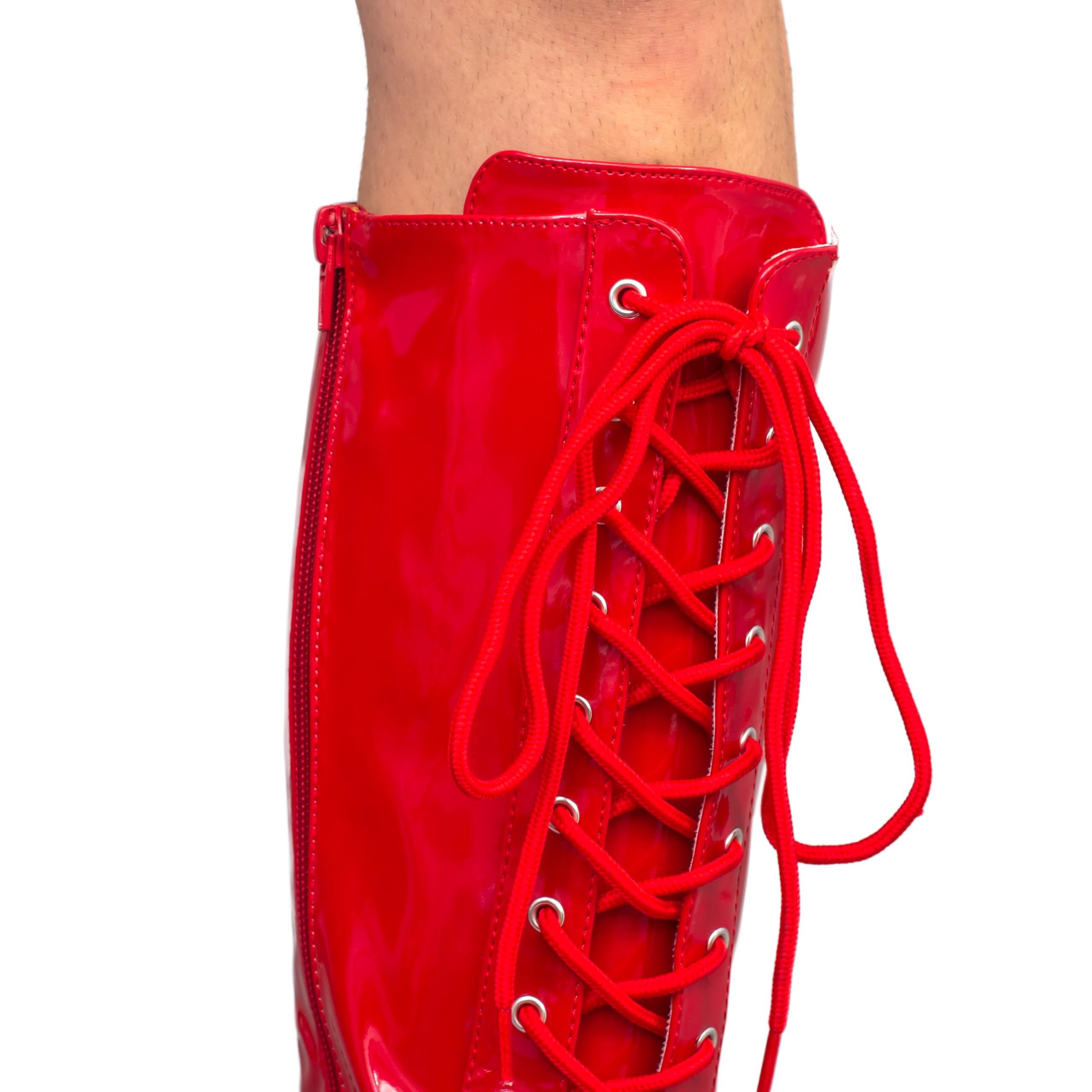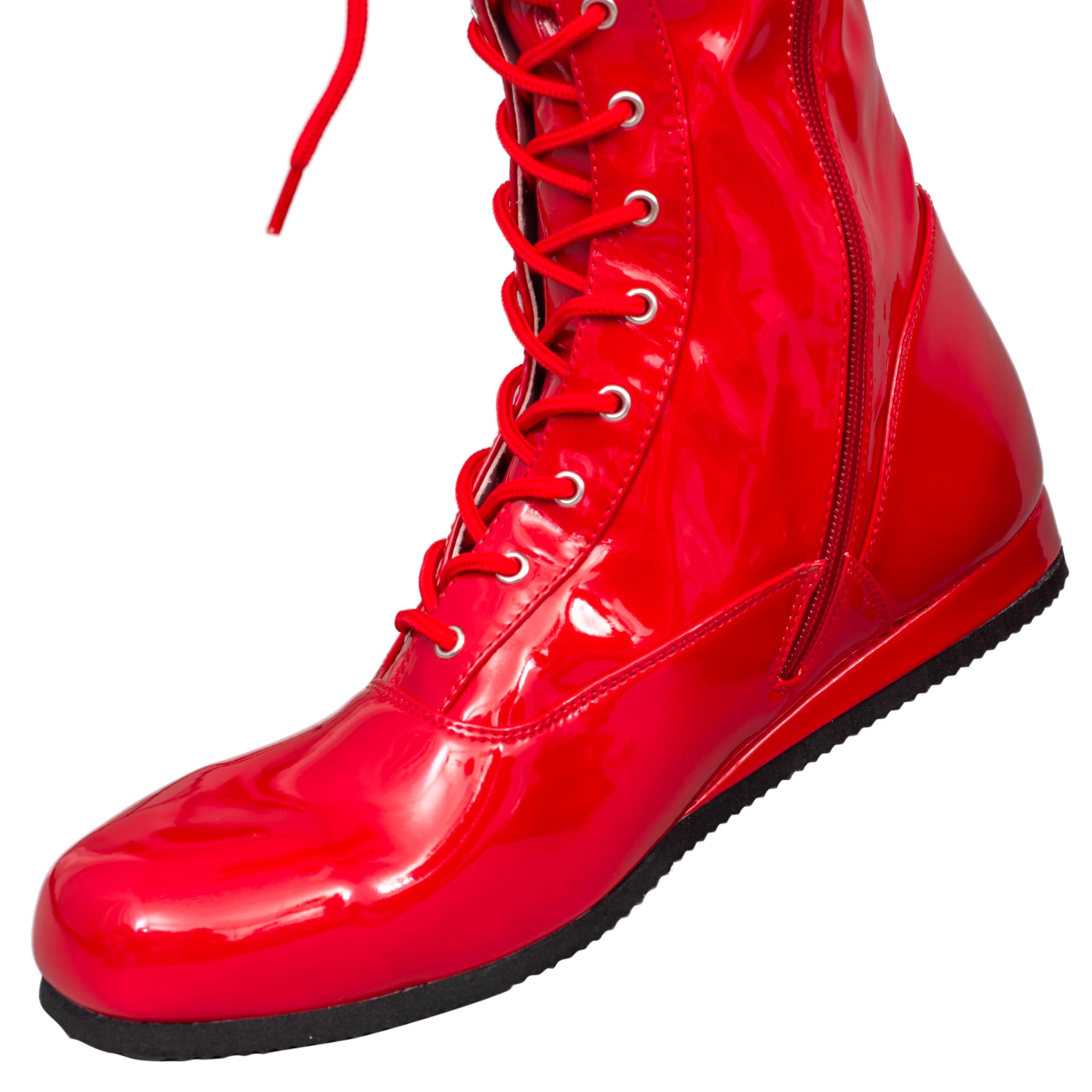 Vinyl drawstring and zipper unisex superhero and pro wrestling boots are available in sizes 8 to 14; available in black, blue, red, and white colors