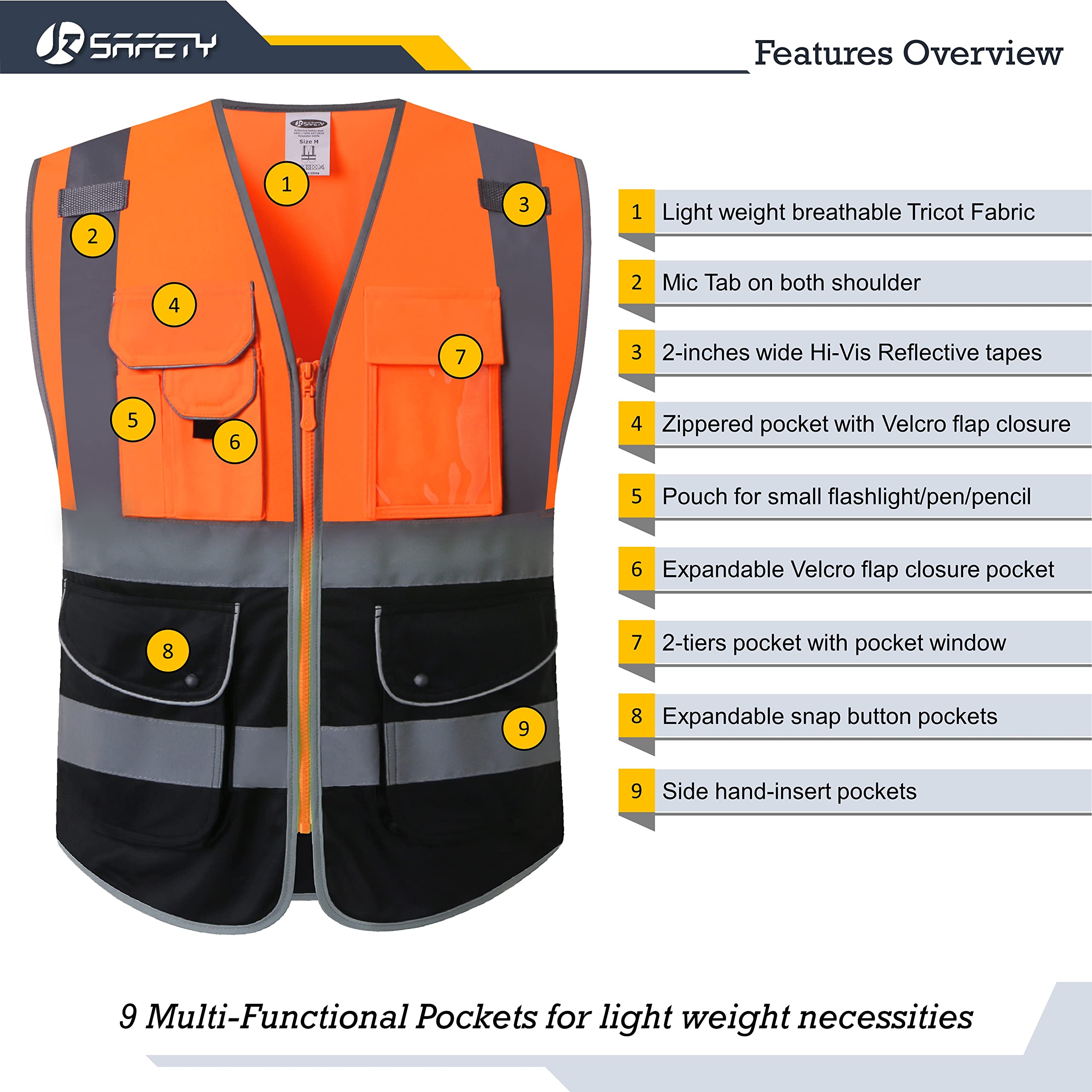 9 MULTI-FUNCTION POCKETS DESIGNED: This Safety Vest comes with 9 Front Pockets with Zipper Velcro clamshell closure for easy access. Enough space for cell phone, flashlight, and laser pointer.
