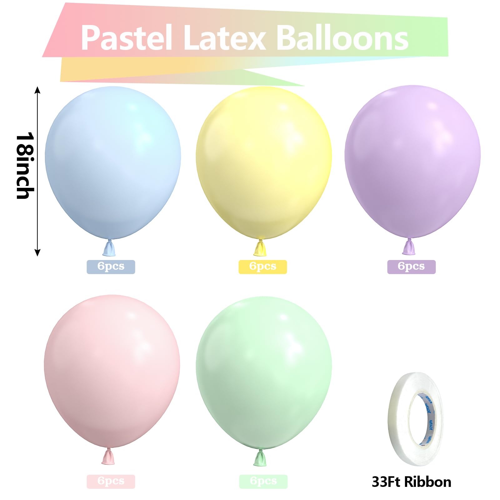 【Set Includes】- Each sets contains 30pcs large pastel balloons of 18 inches 5 colors (pastel pink, pastel purple, pastel blue, pastel green, pastel yellow) and 1pcs white ribbon (33 feet total). The right amount quantity and most suitable color for each party decoration.