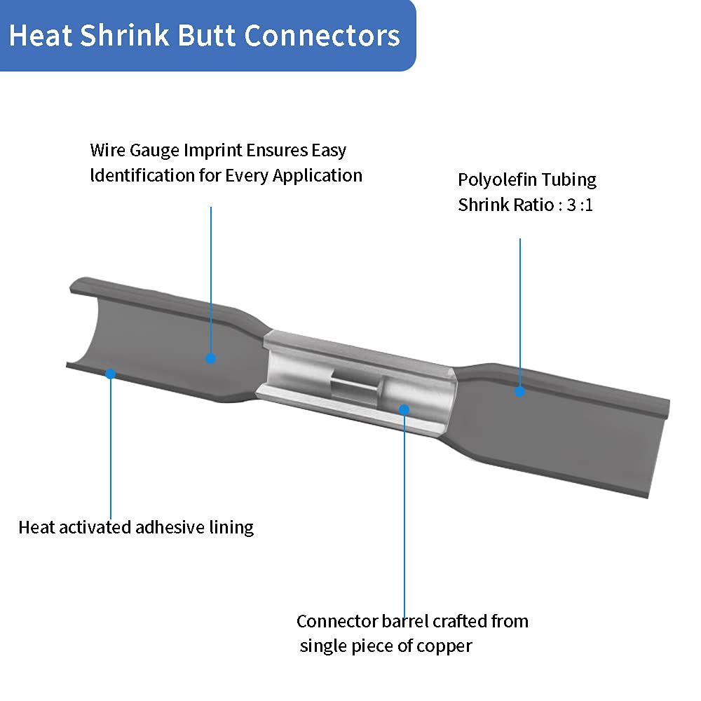 Tinned Copper Core: Butt connectors use a heavy-duty copper core, strong crimp, higher conductivity
