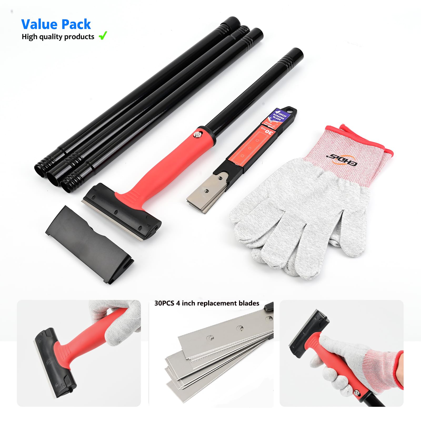 LONG HANDLE GLASS SCRAPER TOOL SET CONTENTS: 1PC 16 inch- 58inch long handle 4" blade Glass Scraper with safety cover +30PCS Double Edged Replacement Razor Blades with Storage Box + a pair of working glove
