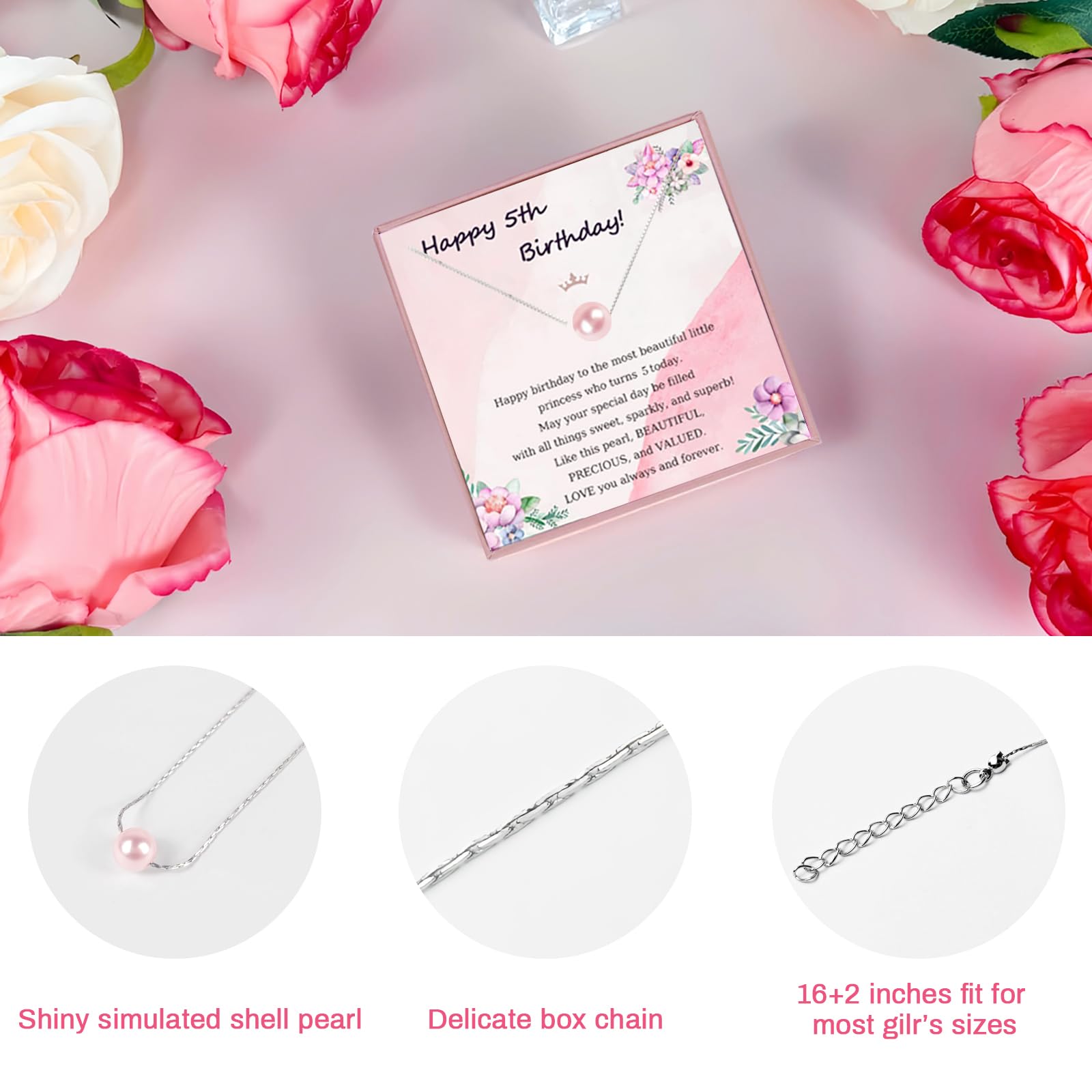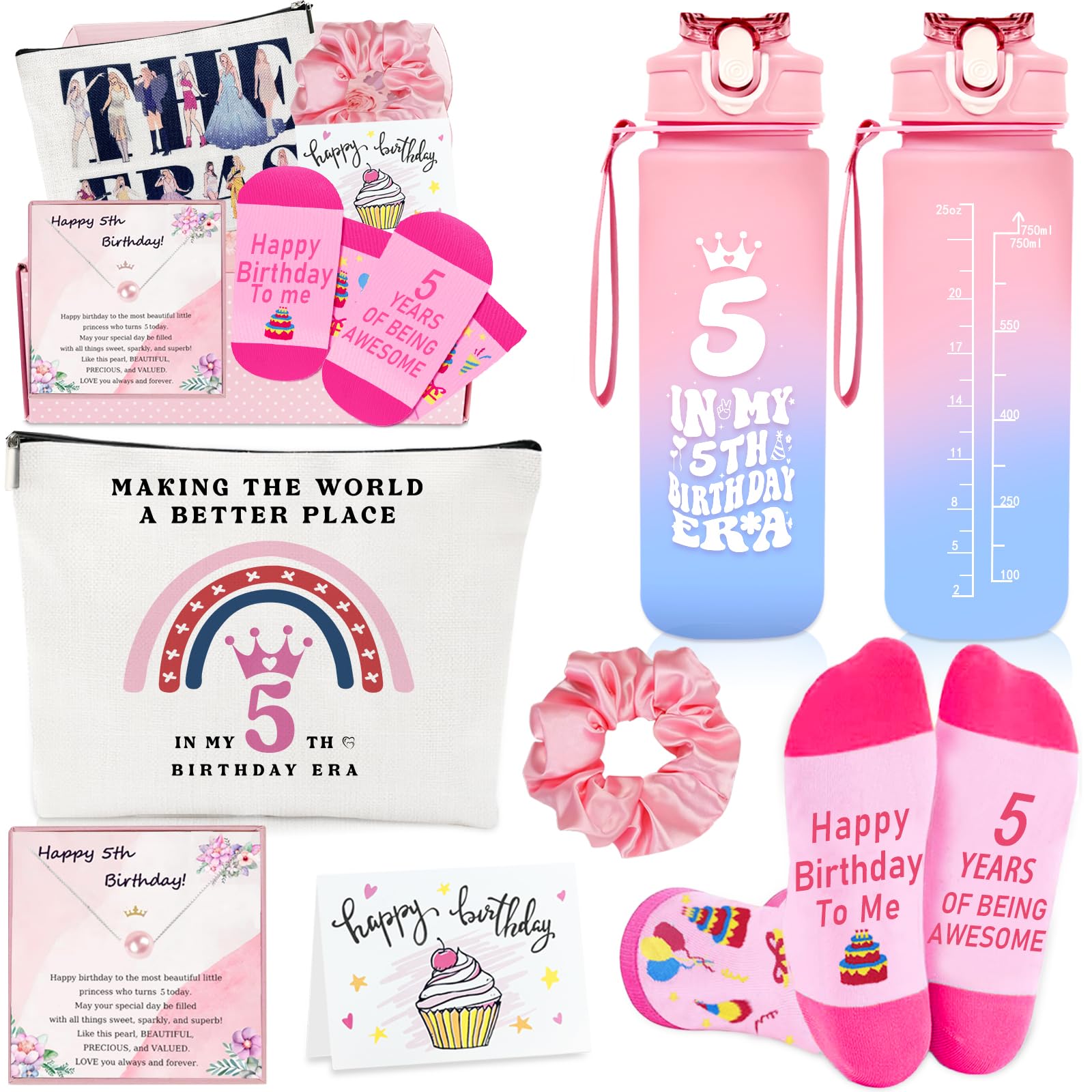 【7 Pieces Unique 5th Birthday Wishlist Gifts 】7 Beautifully packaged gifts 1 x 25 oz tumbler, 1 x stylish pearl necklace with a souvenir card, 1 x double-sided printed cosmetic bag, 1 x fancy birthday socks, 1 x hair tie, 1 x birthday card(Write your blessings), 1 x gift box. Receiving this gift box set, she will feel extremely happy and cherished, as if she has an exclusive luck and blessing