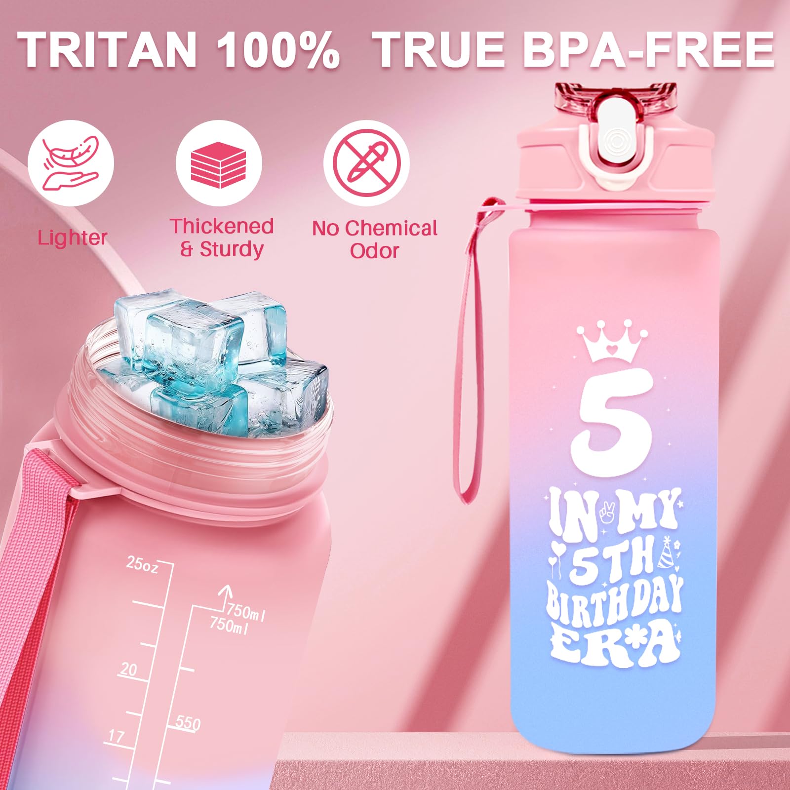 【"IN MY 5TH BIRTHDAY EAR" 25oz Sports Water Bottle】Durable & BPA-free, non-toxic plastic, it is a safe choice for both children and adults alike. Open with one hand by clicking the button to access water. Featuring the words "IN MY 5TH BIRTHDAY EAR" and scale mark, motivational and beautiful. This bottle is lightweight. Easy to carry to your camping, gym, school, or anywhere. Cleaning is also a breeze