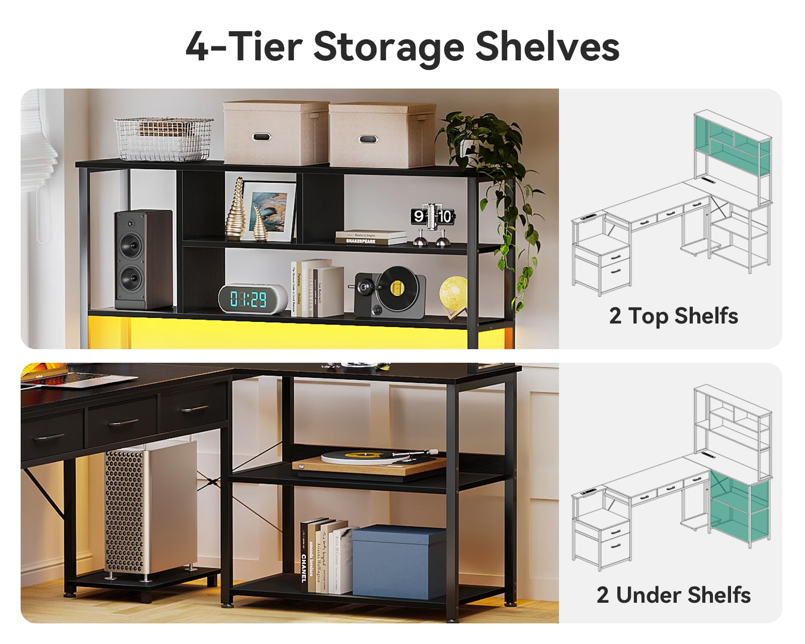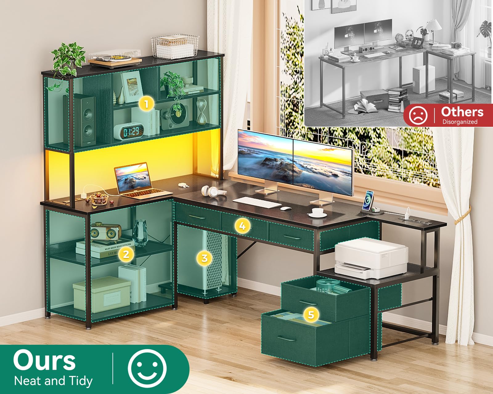 【5 Large Fabric Drawers】Includes 1 fabric file drawer and 4 spacious storage drawers for ample organization. The file cabinet accommodates letter, A4, and legal-sized documents. Built with sturdy construction, this computer desk also supports printers, scanners, fax machines, and other office essentials—keeping them within easy reach while maximizing workspace efficiency.